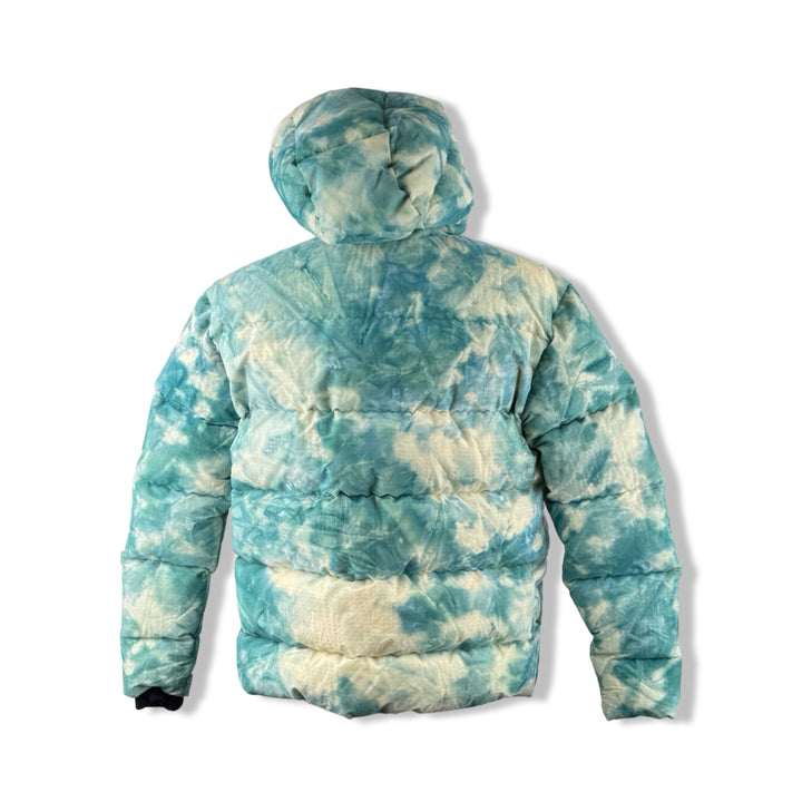 - Hooded tie dye patterned zip puffer jacket with dual front pockets. Size label missing, looks like a Large