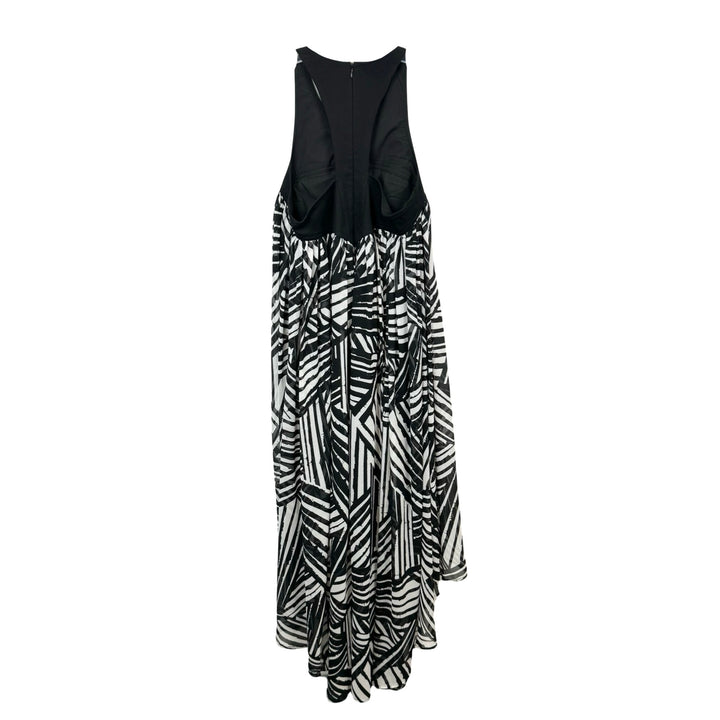 - High-low dress with twill bodice and abstract print chiffon skirt. Back zip closure.