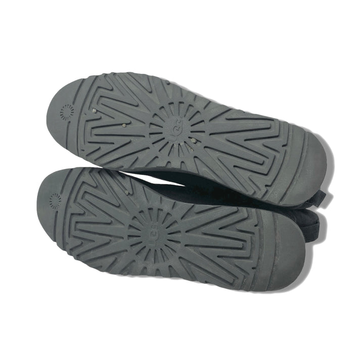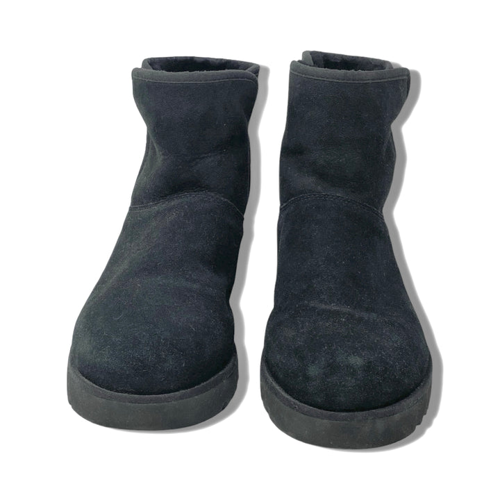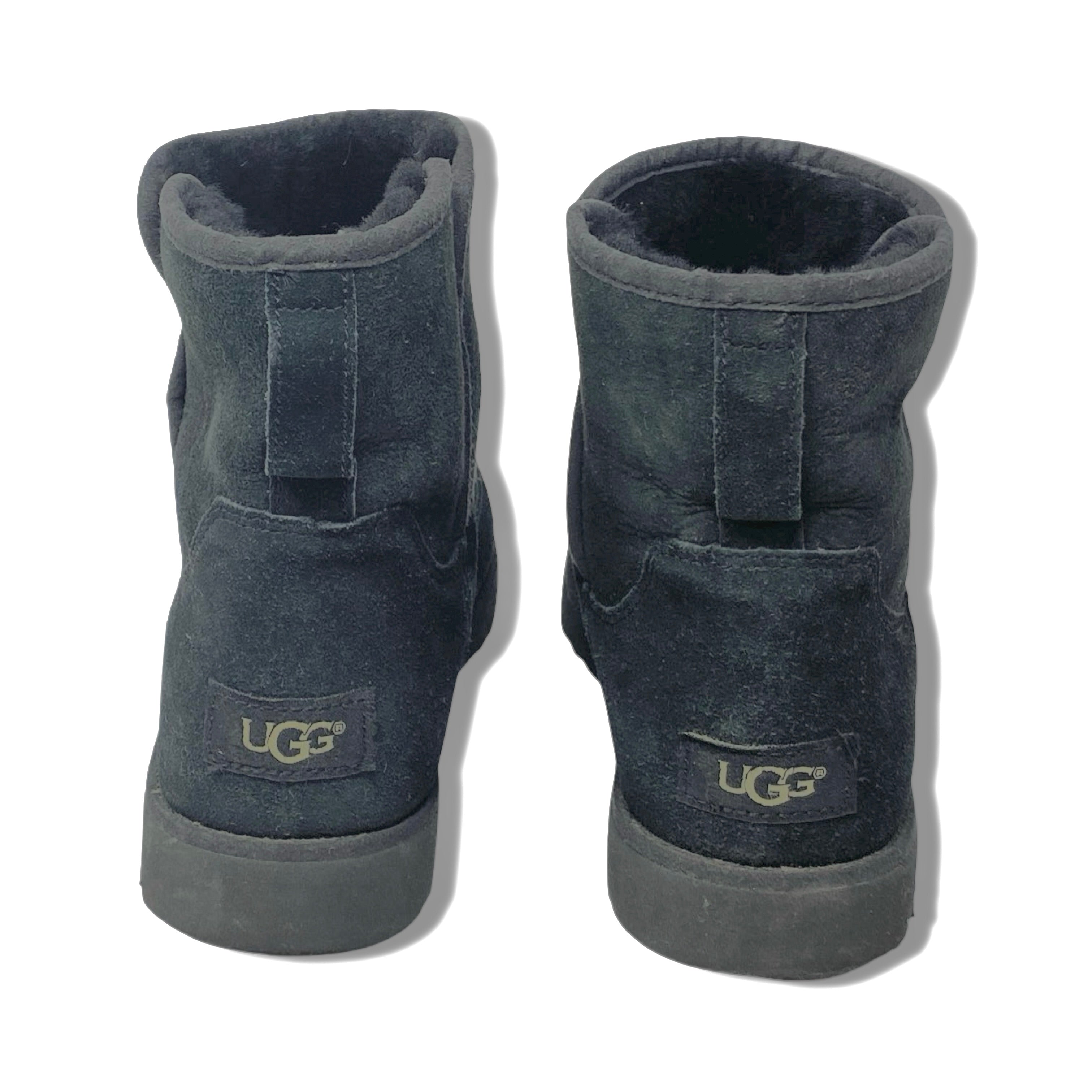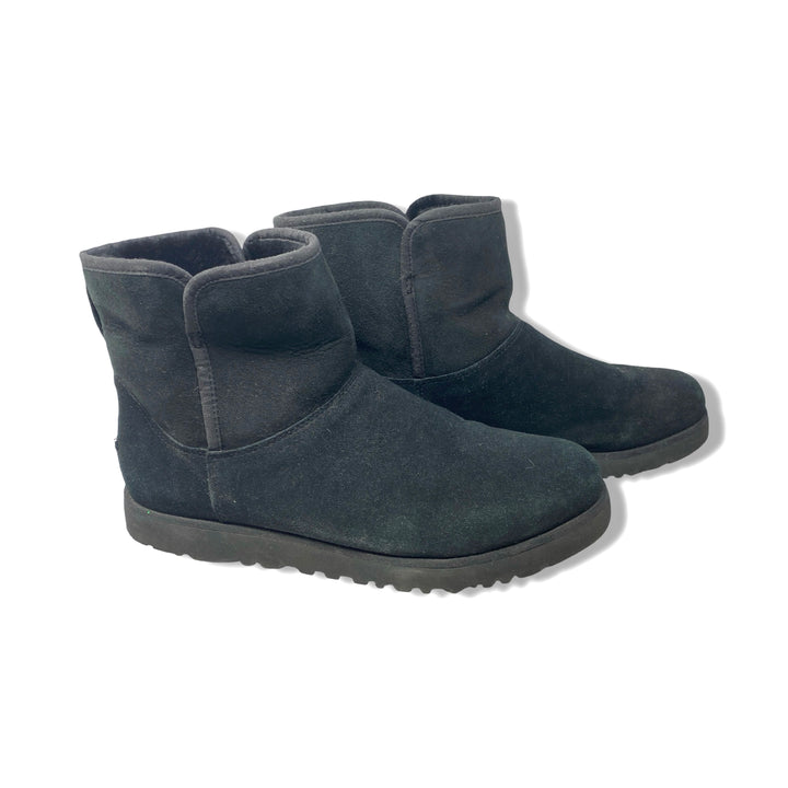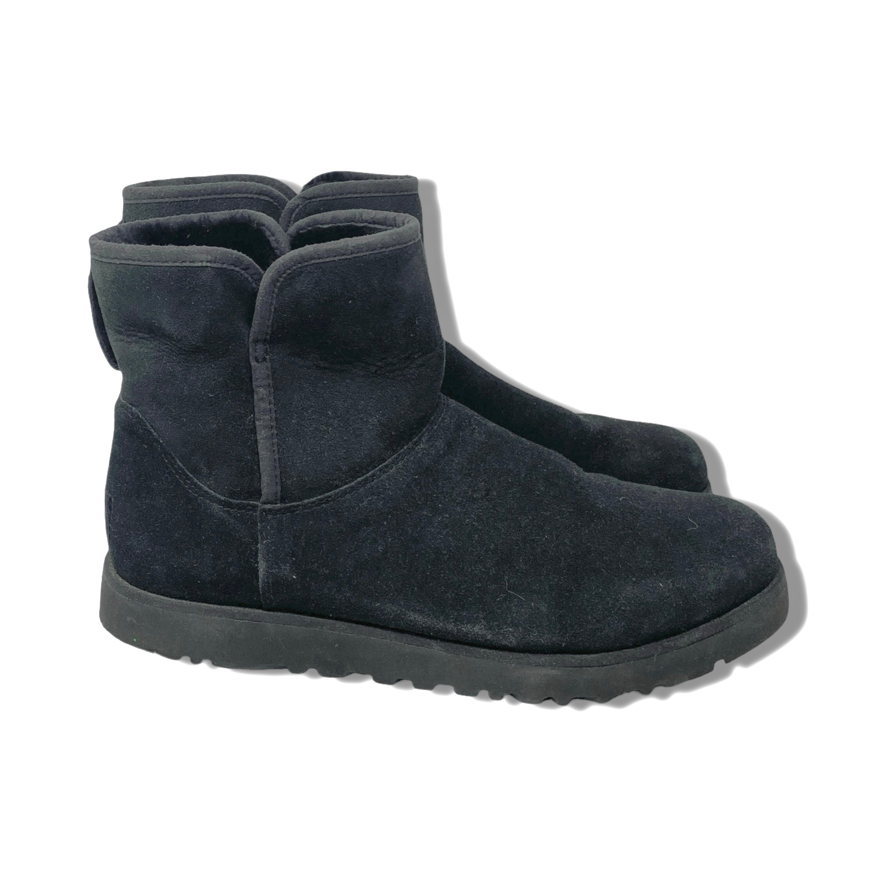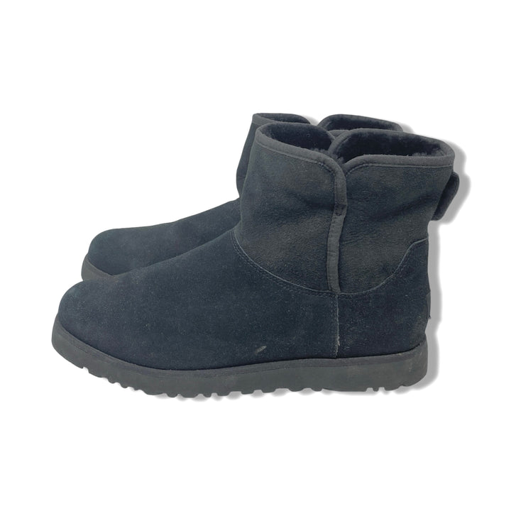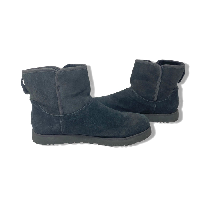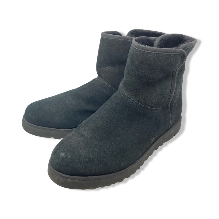 - Slip on suede ankle boot with logo and pull tab on back. Sheepskin lining. Signs of wear throughout.