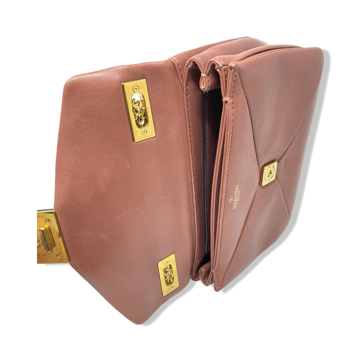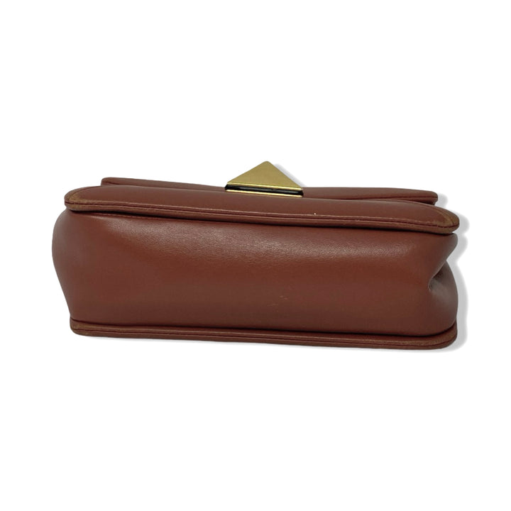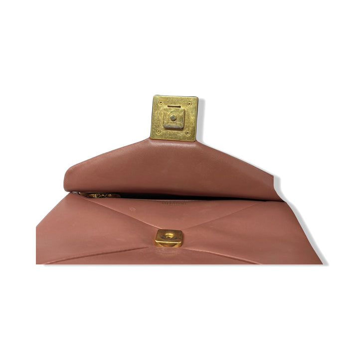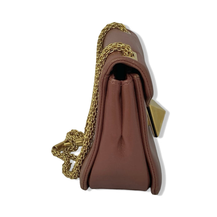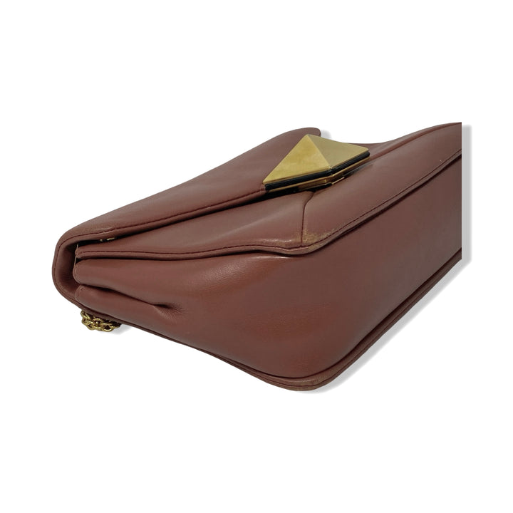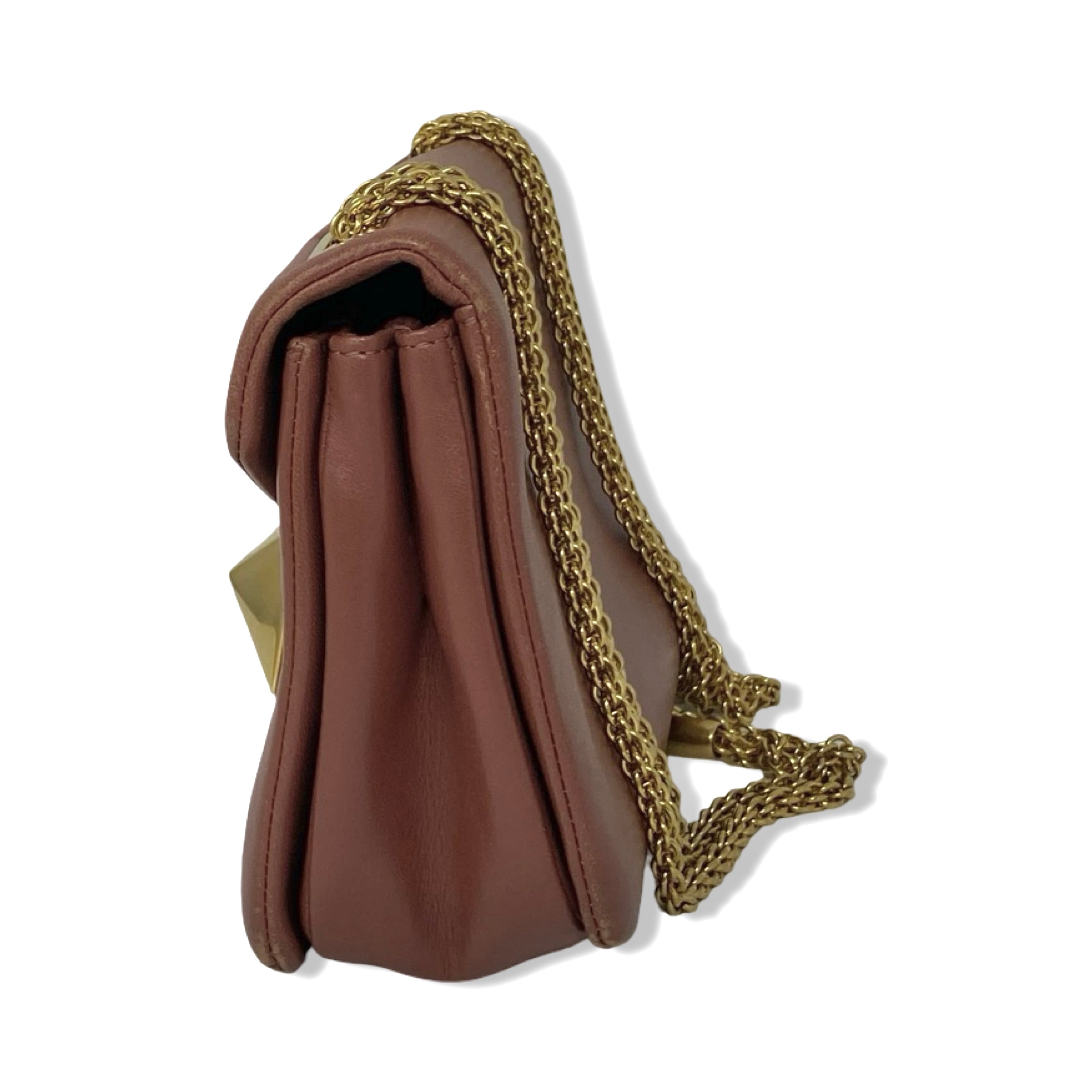 - Crossbody bag featuring a sliding chain shoulder strap, maxi stud with snap closure, one interior open compartment, and one patch pocket. Designer dust bag included. Some signs of wear (pictured)