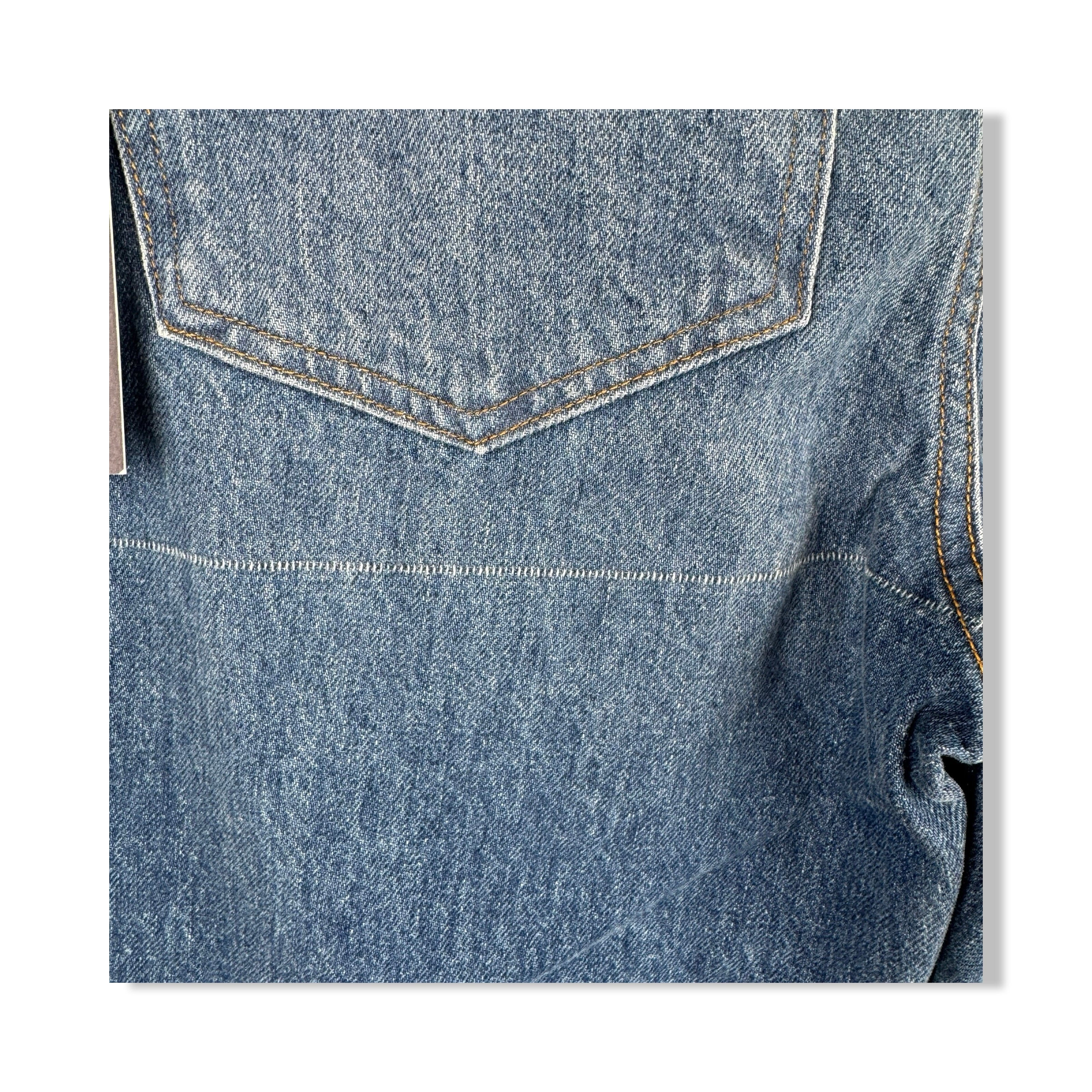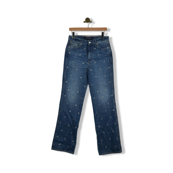 - High rise jean with grommets details at front. Fabric pulls at back (pictured)