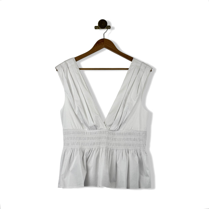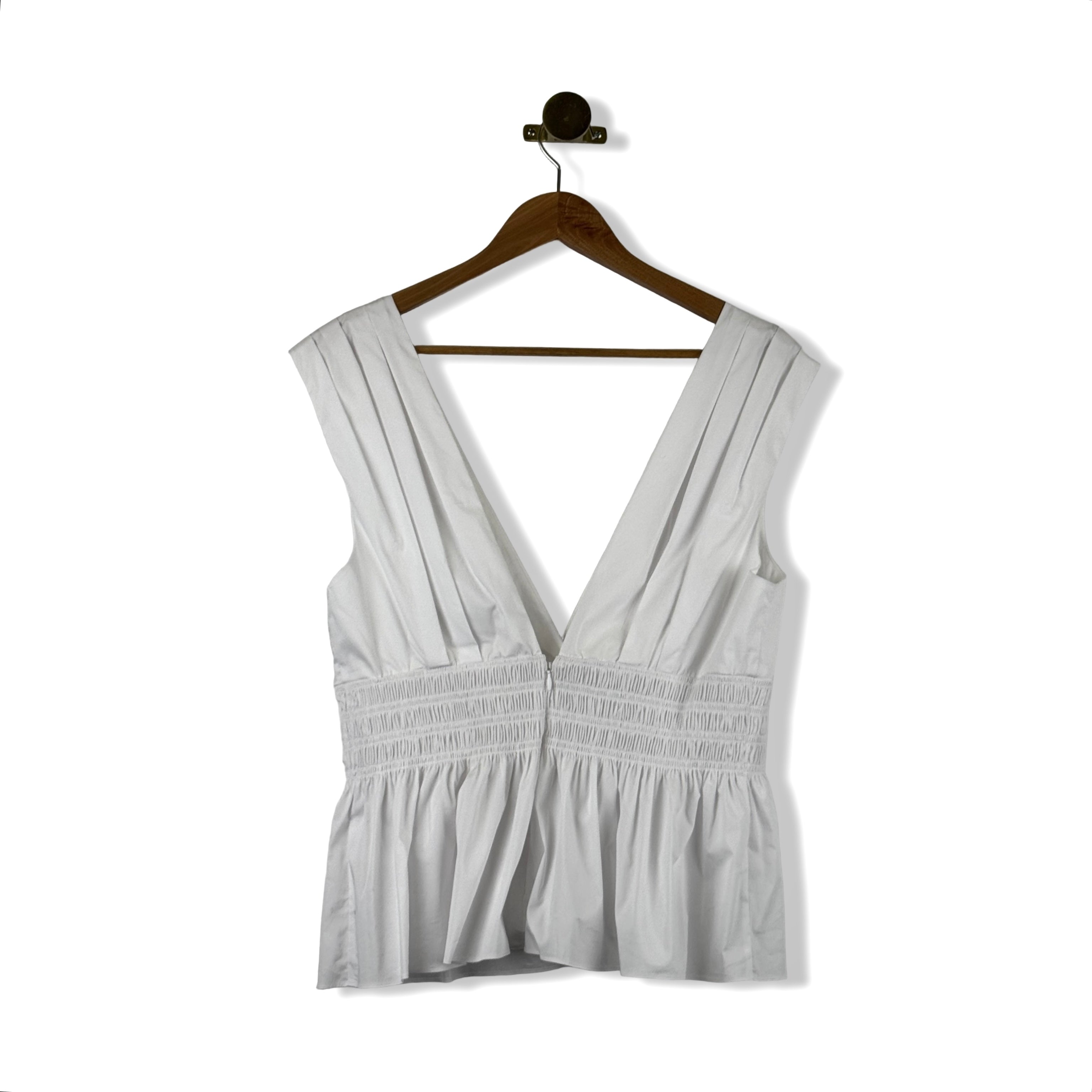 - Cotton-blend poplin top with deep v neckline. shirred waist and zip closure on back.