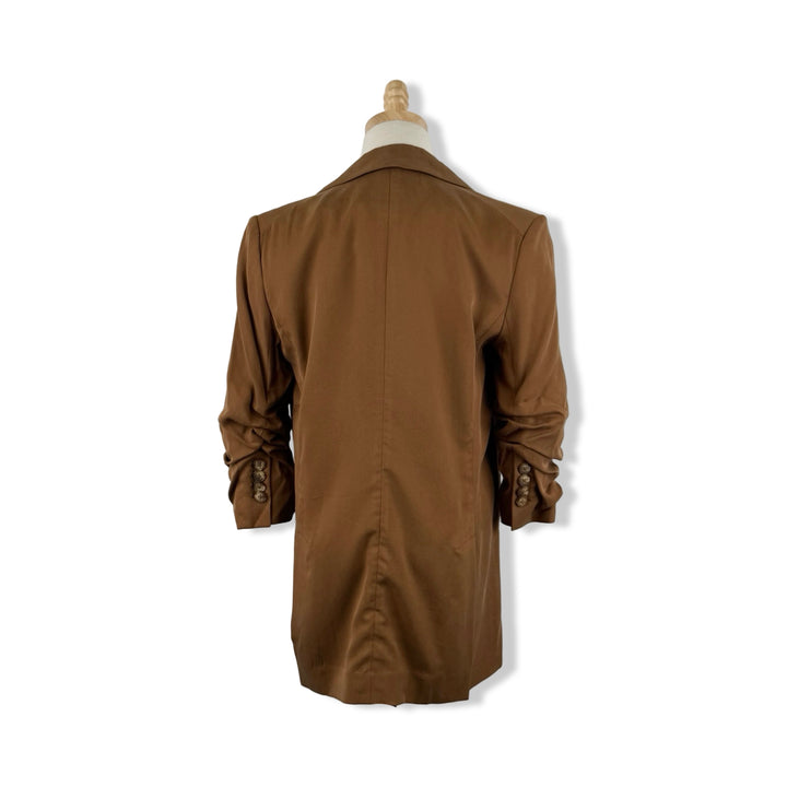 - Double breasted button down blazer with ruched half sleeves and faux pockets