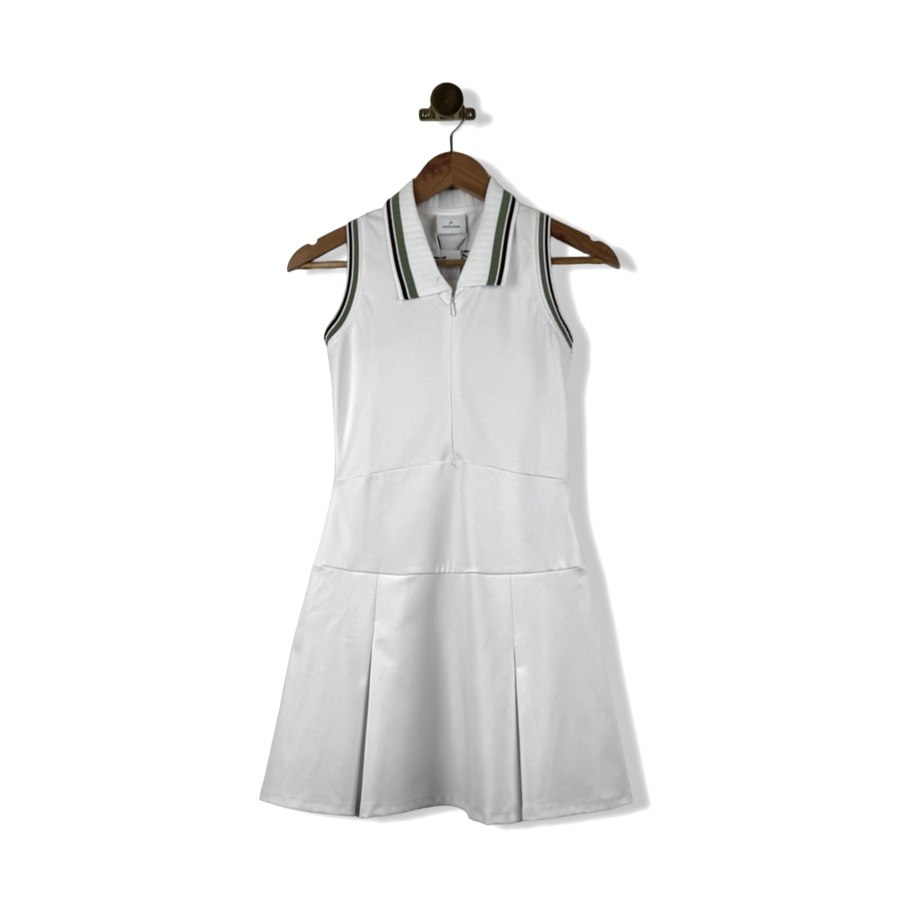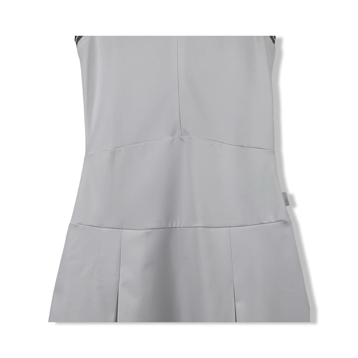 - Racerback sleeveless dress with half zip closure on front and a box-pleat skirt and contrast trim detail