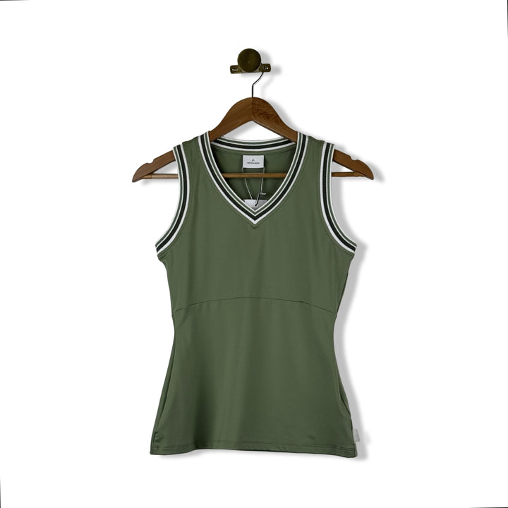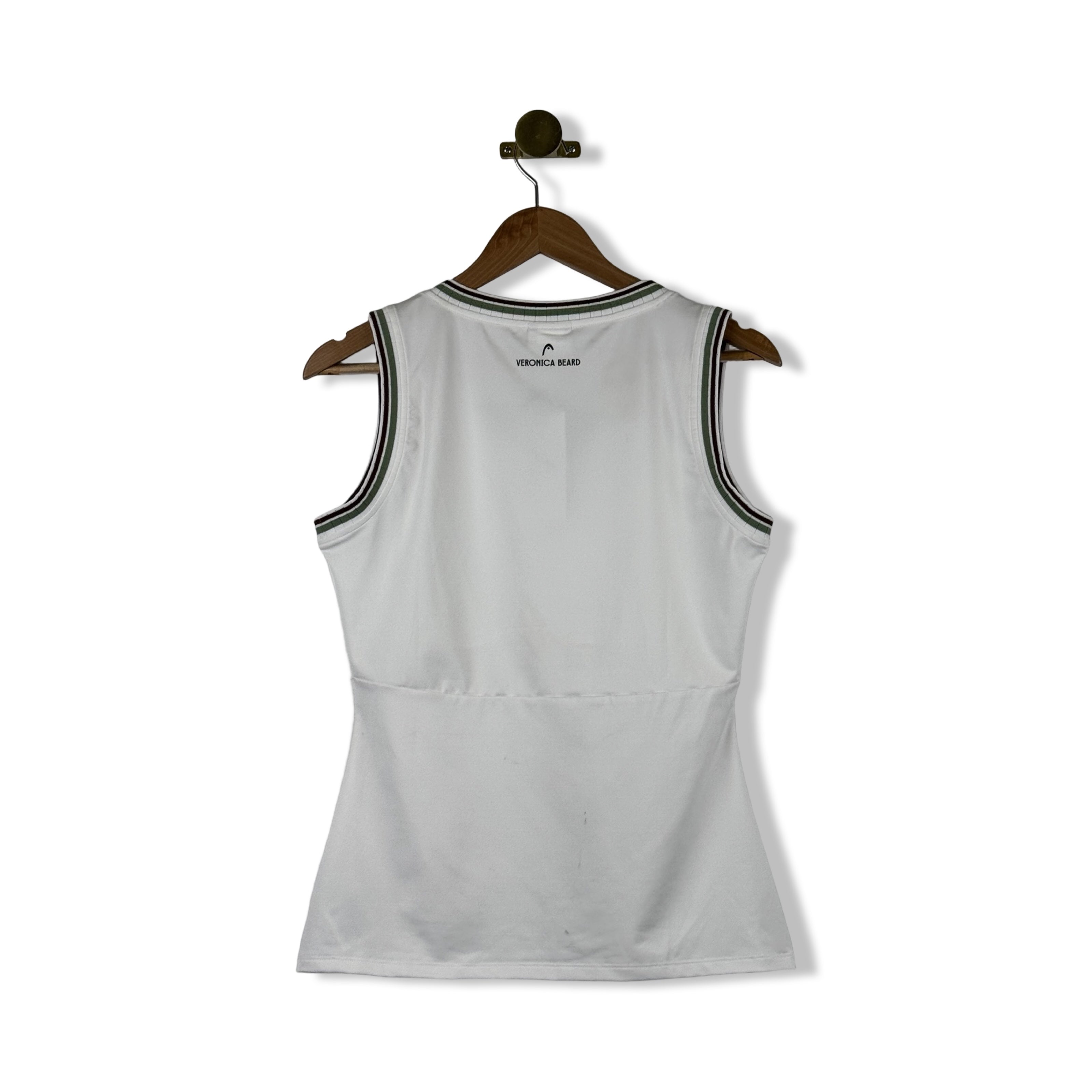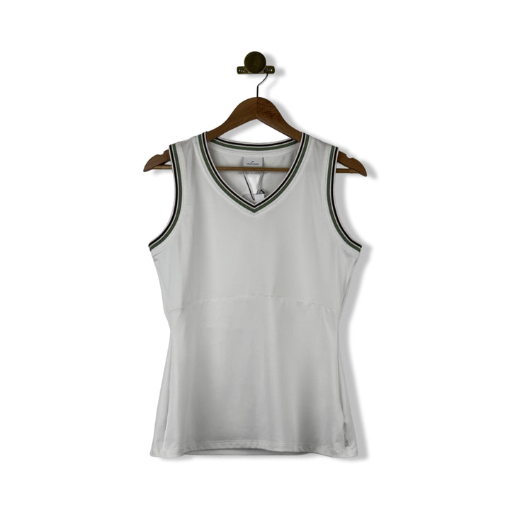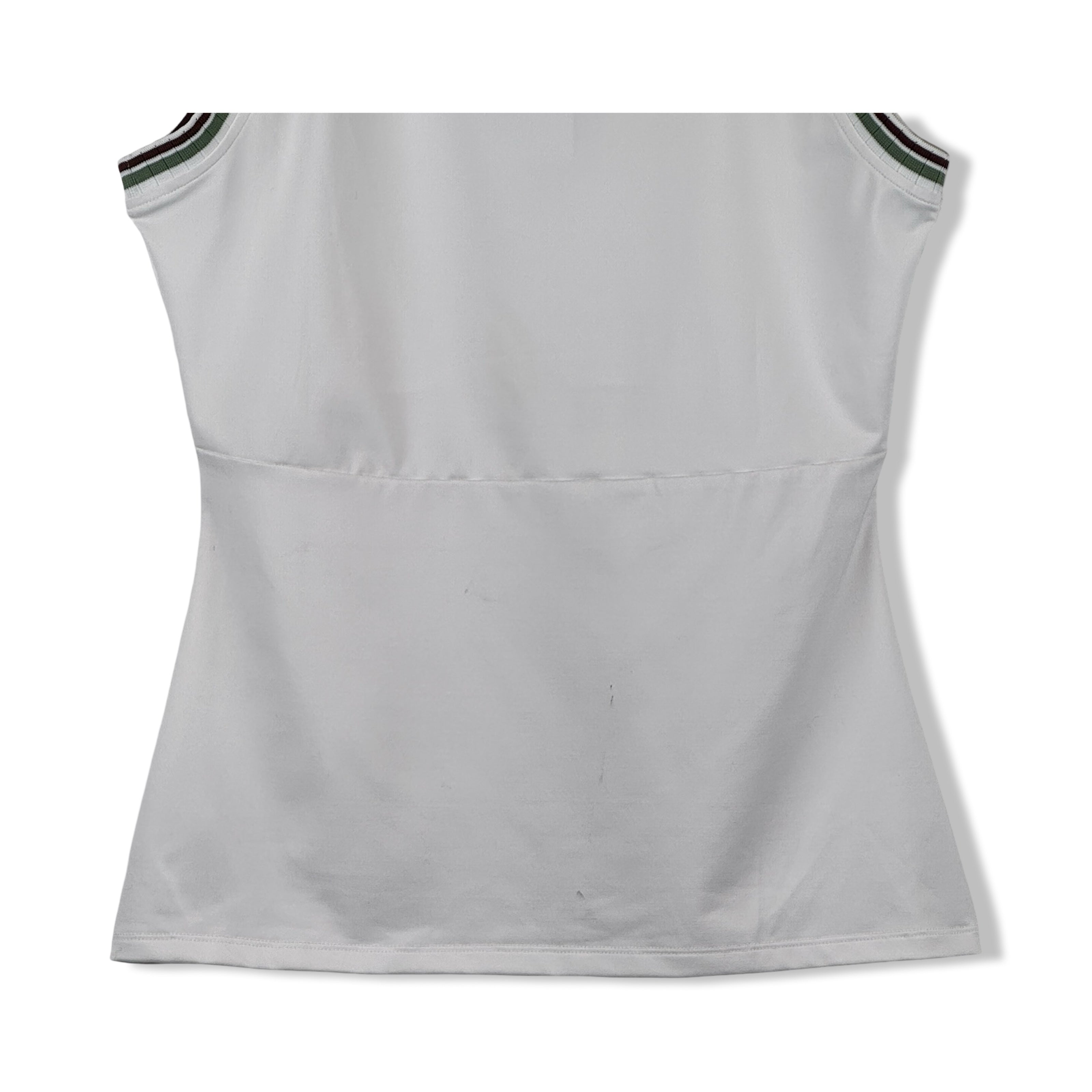 - Sleeveless tank top with seam stitching on waist and contrast trim detailing. Some signs of wear on white tank (pictured)