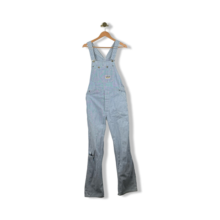 - Striped overalls with front/back pockets and hardware. Signs of wear throughout. Missing size label, looks like a size Medium. Please check measurements for reference.