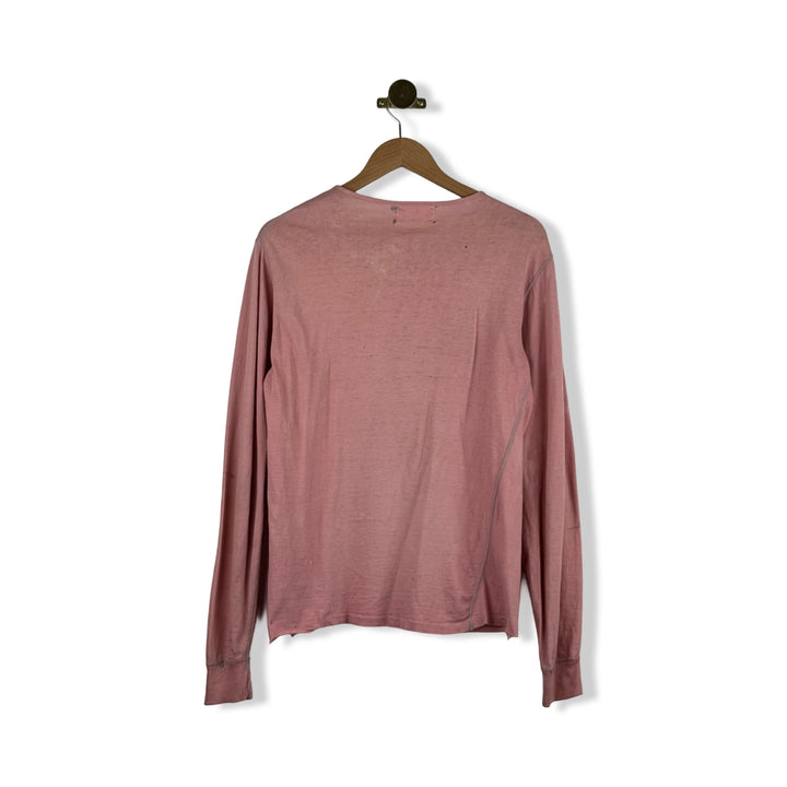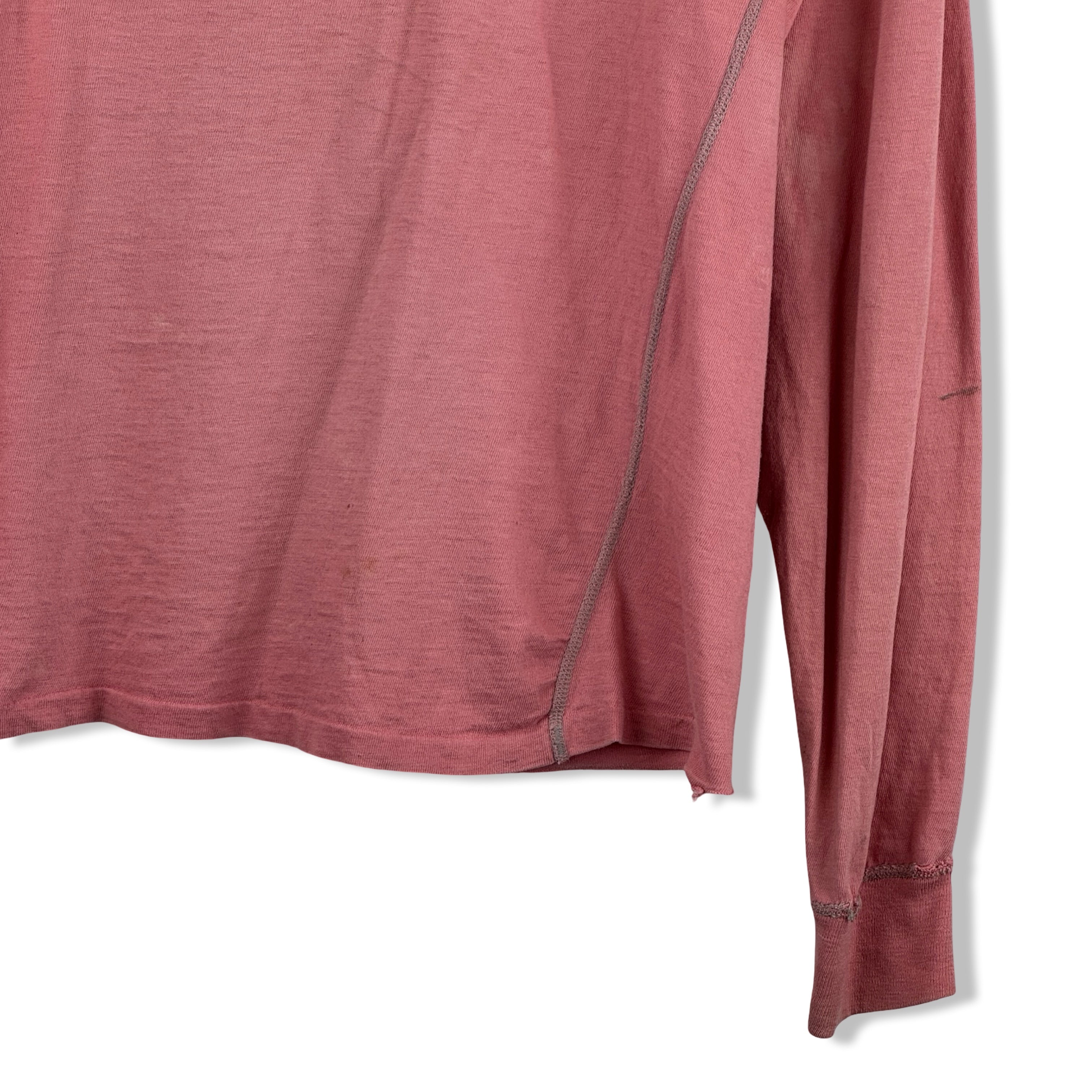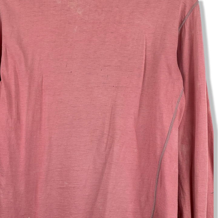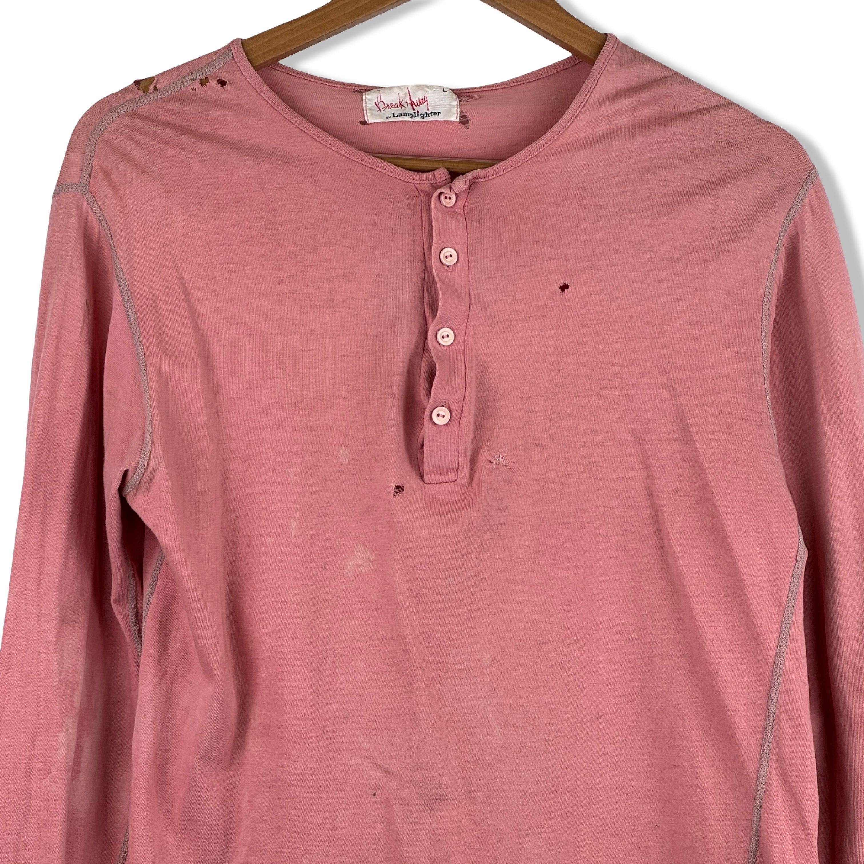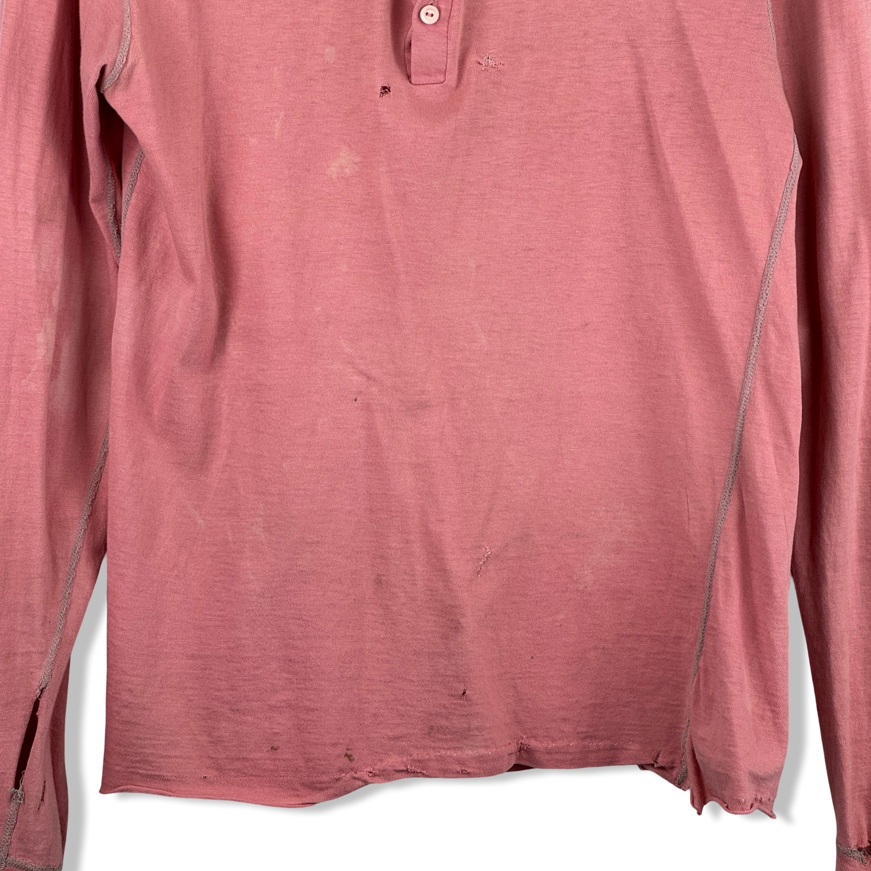 - Long sleeve lightweight top with half button up placket and contrast stitching. Labeled size Large, please check measurements for reference. Signs of heavy wear throughout (pictured)