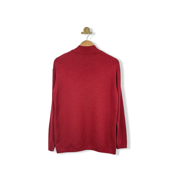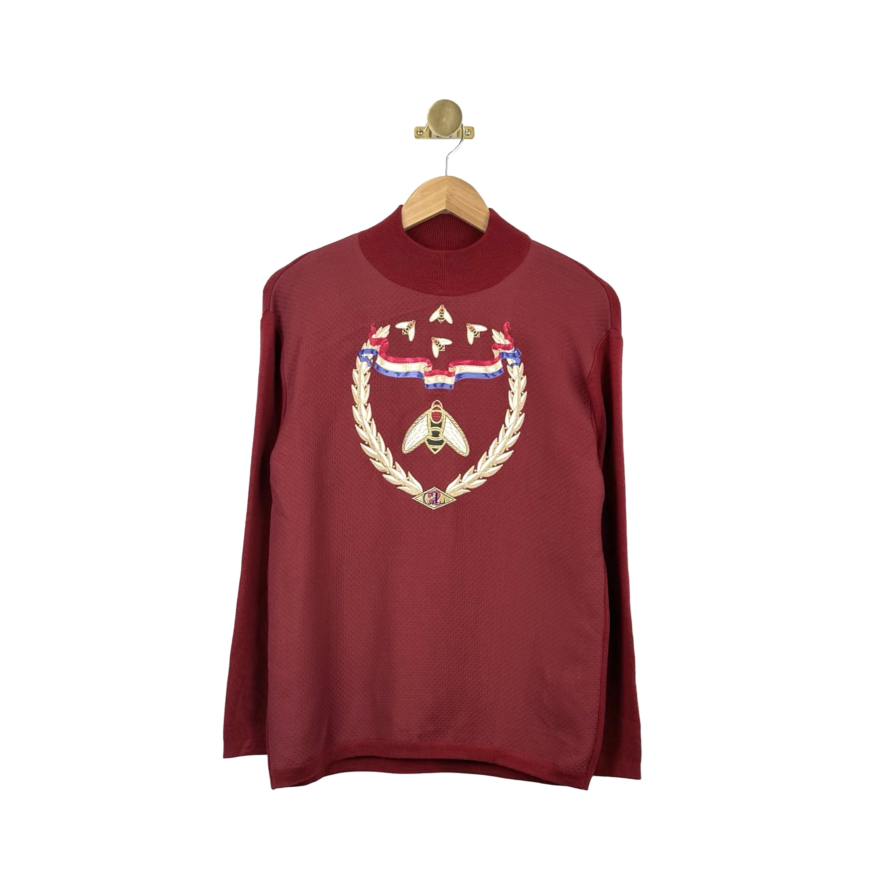 - Textured crewneck sweater with embroidered graphic on front. Size label missing, looks like a Small.