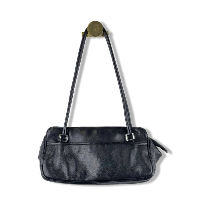 - Baguette style handbag with zip closure, interior zip closure pocket, slip pocket and thin straps. Some signs of wear.