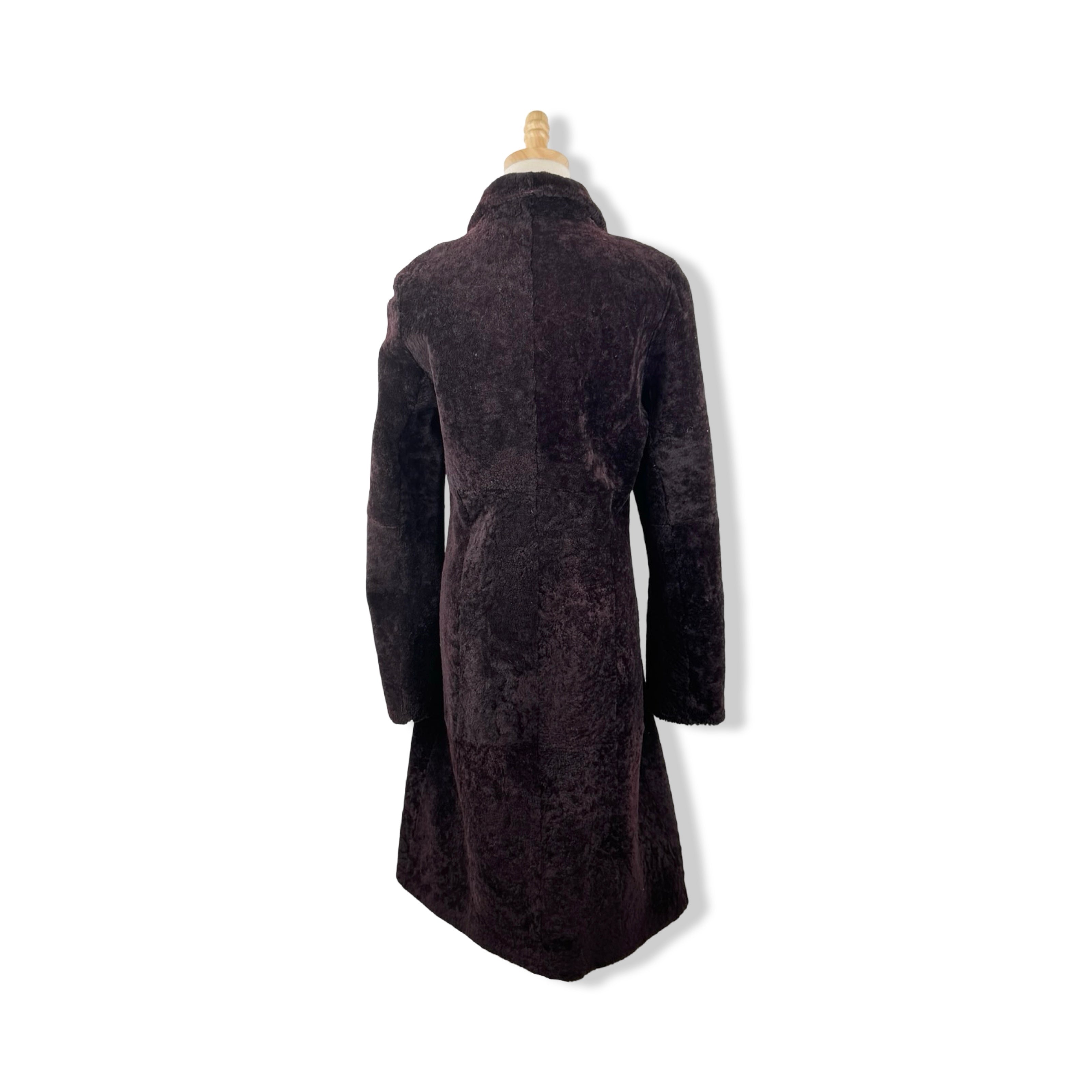 - Hook and eye closure shearling overcoat. Size not listed. Looks like size X-Small. Please check measurements