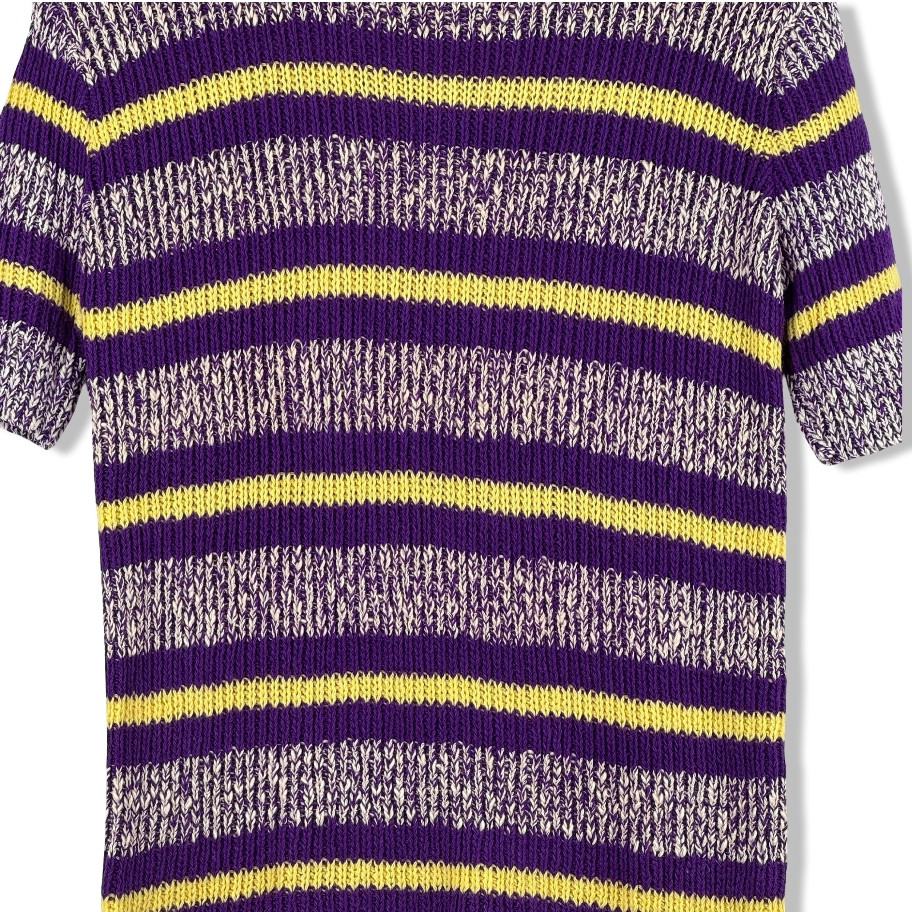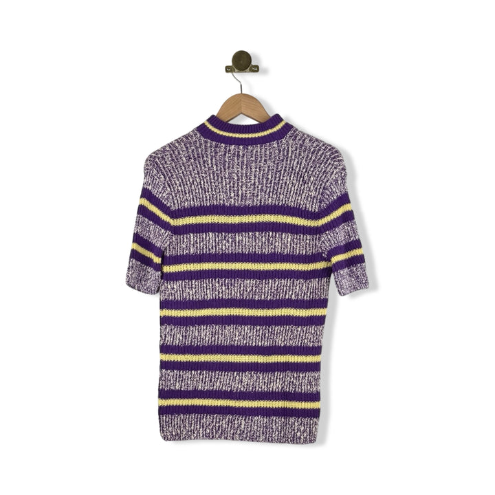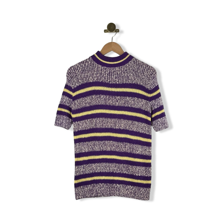 - Short sleeve knit top with stripe pattern throughout and rib knit trim detail. Designer/size label missing, looks like a size Medium. Please check measurements for reference.