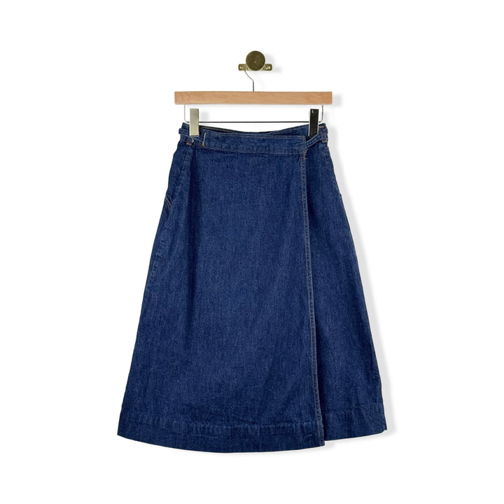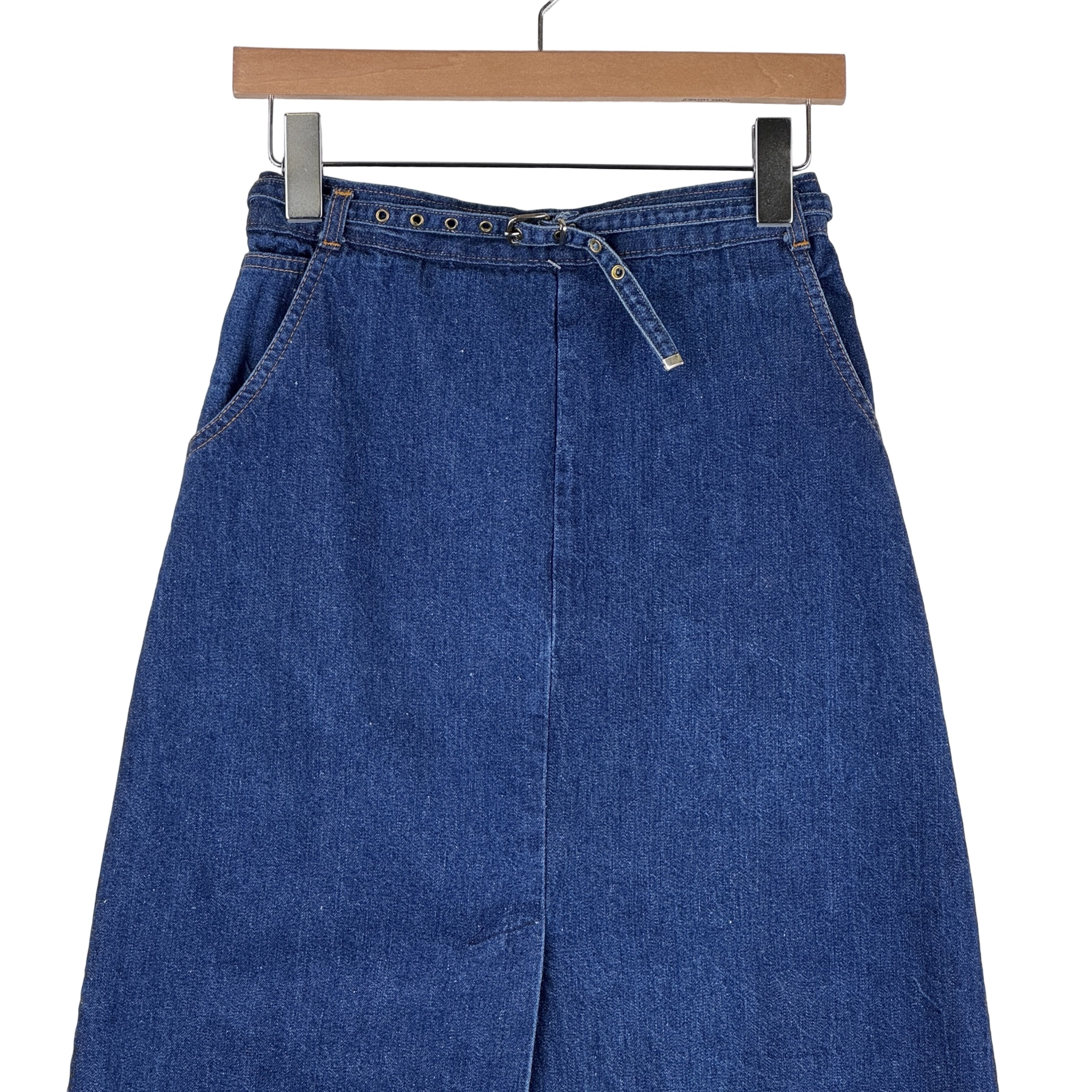 - Pull on denim skirt with a wrap around belt and button closure. Pockets on front and open slit on front center. Missing size label, looks like a size x-small. Please check measurements for reference