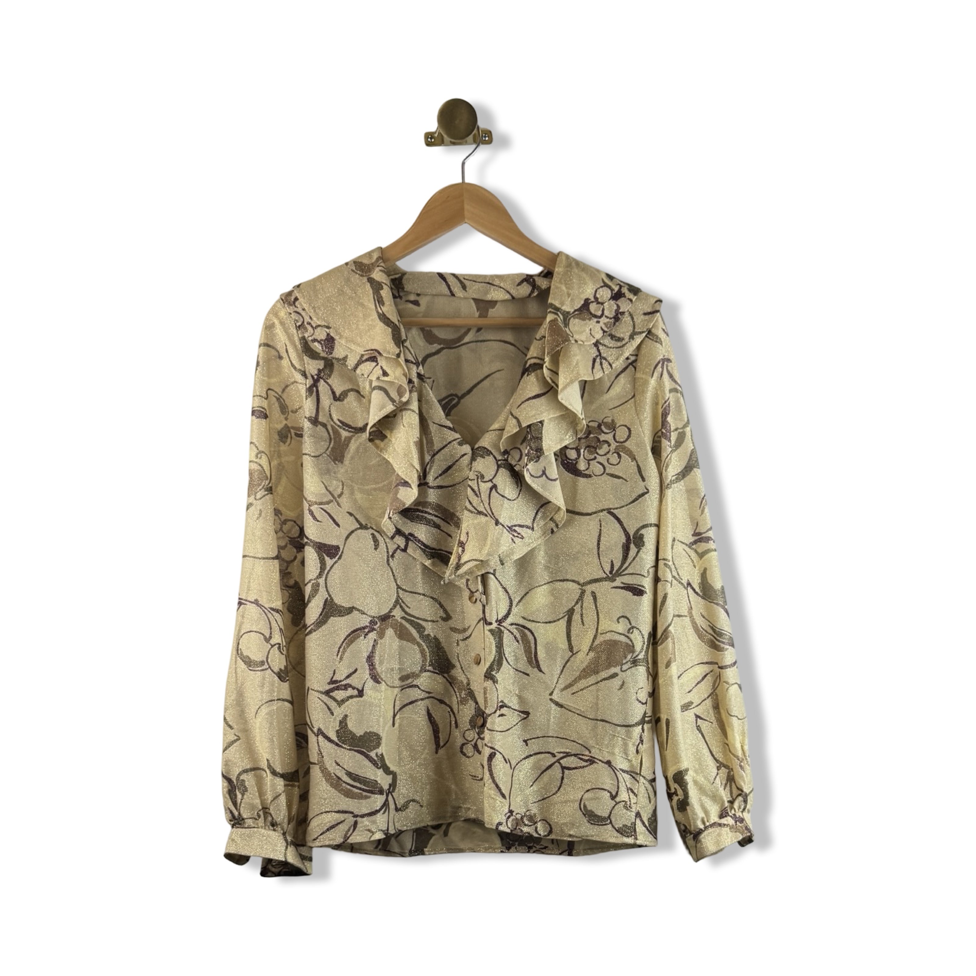 - Sheer, long sleeve top with ruffle trim on neckline and button up closure. Metallic fibers throughout. Missing size label, looks like a size Large. Please check measurements for reference.