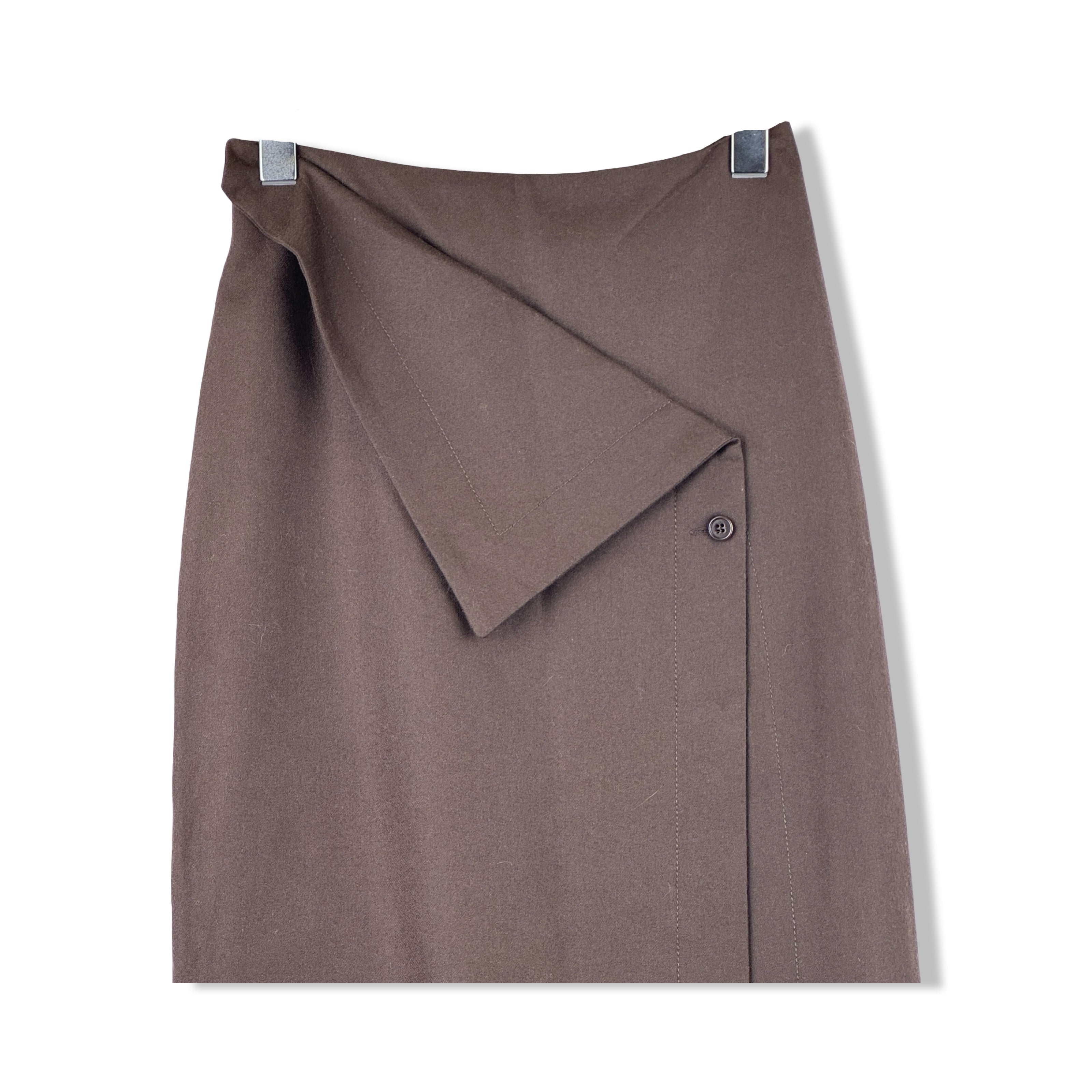 - Long skirt with flap over button up panel on front and seam stitch detail.