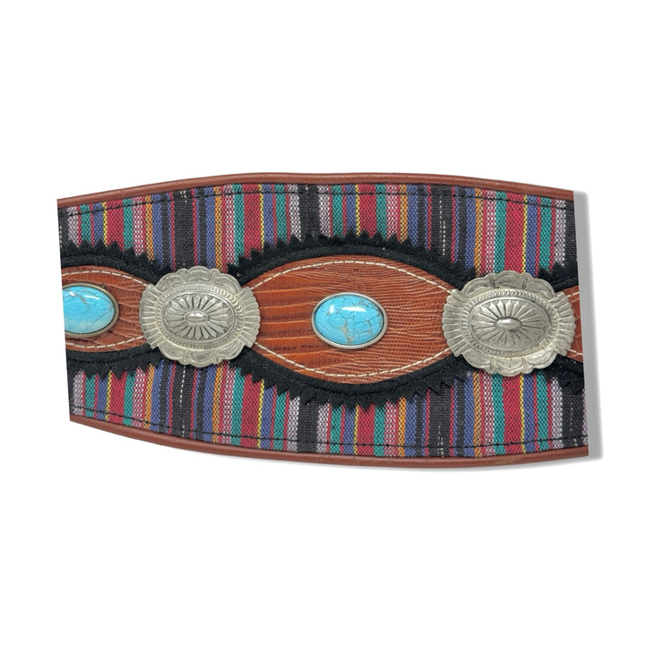 - Waist belt with stripe print fabric and concho/stone detail on front.