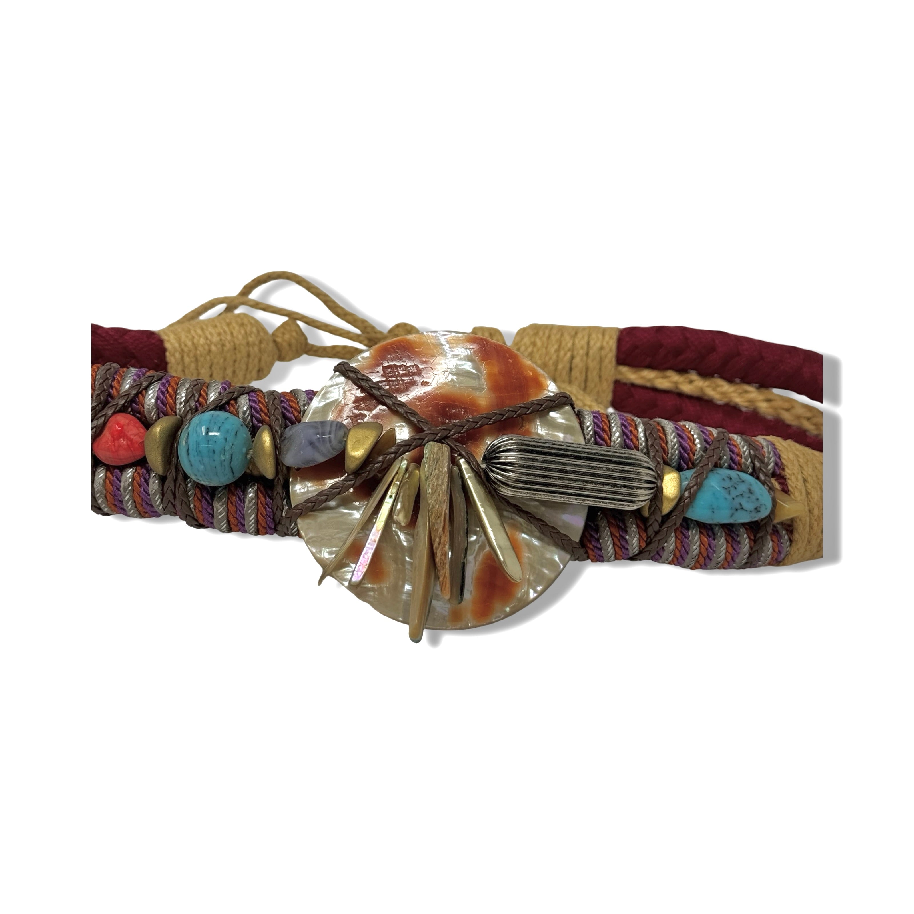 - Braided self tie rope belt with stones on front.