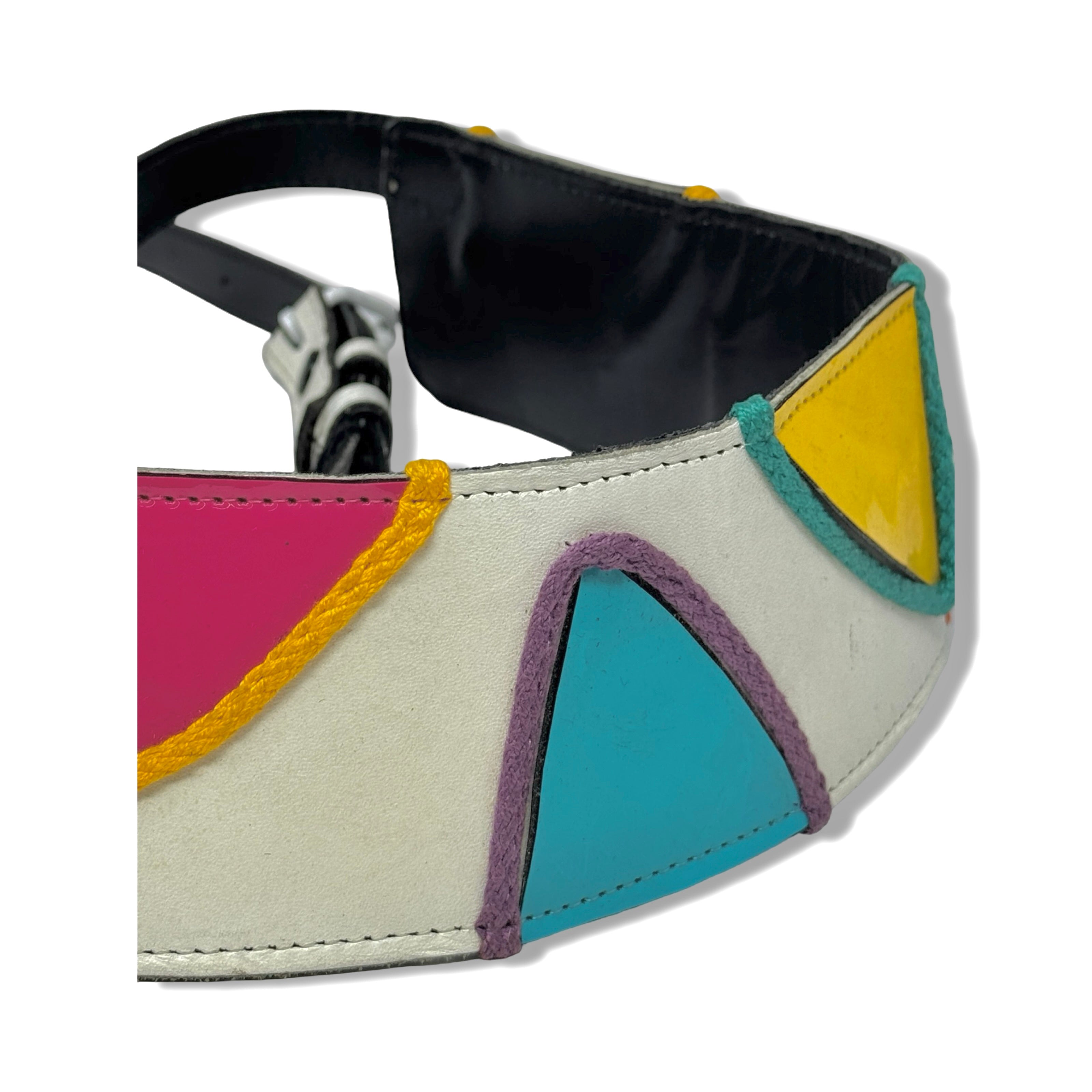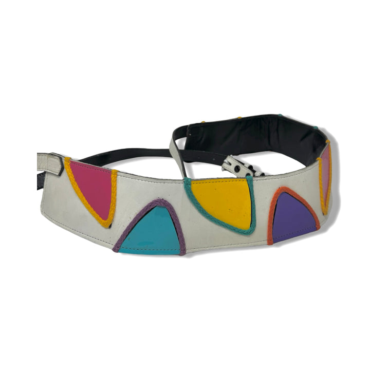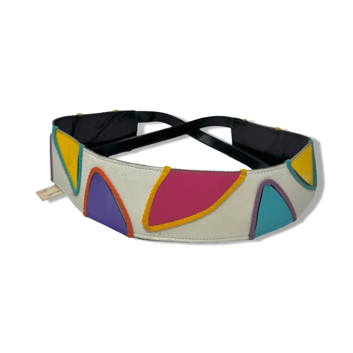 - Leather wrap belt with multicolor patches and knit trim throughout.