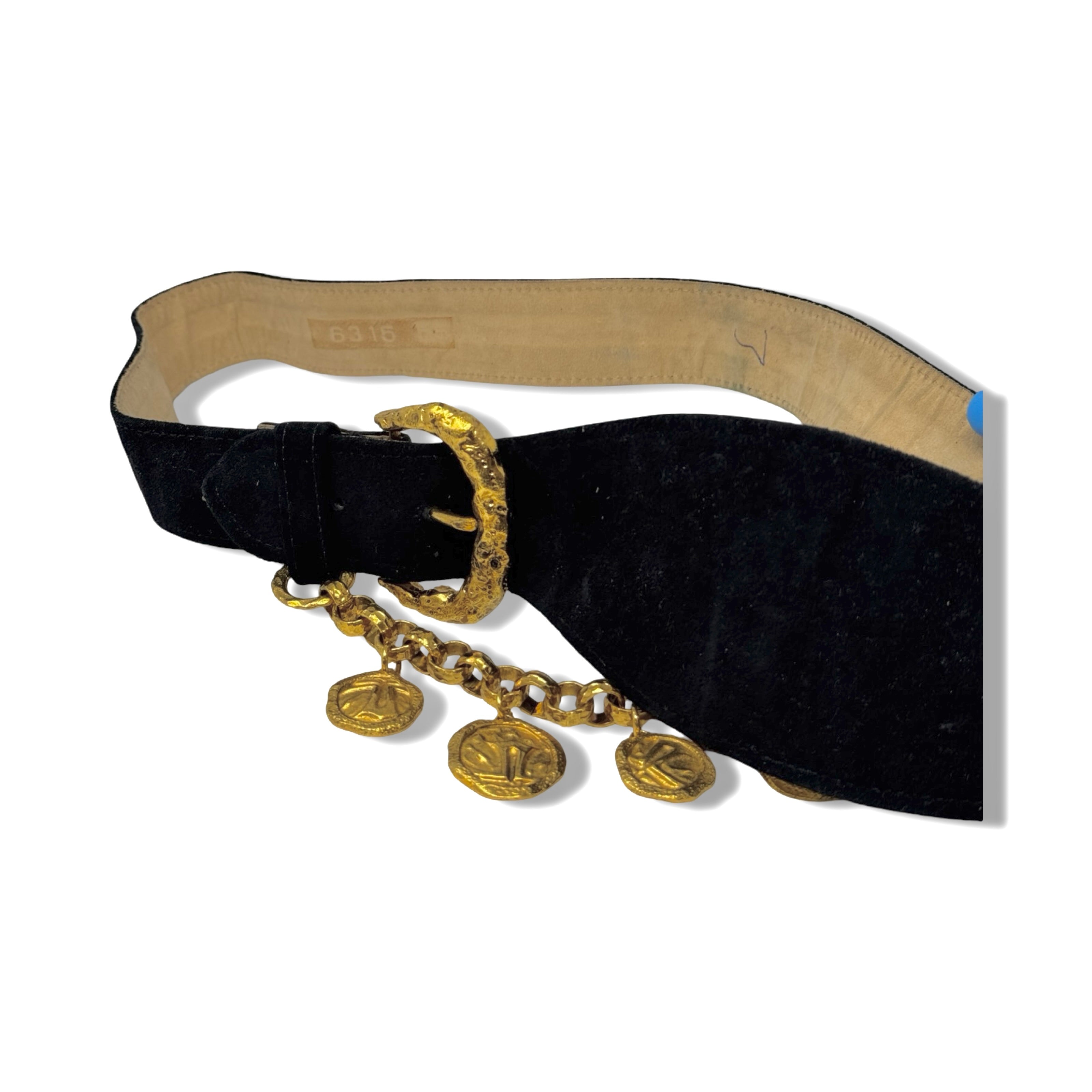 - Velvet double buckle belt with link coin chain detail