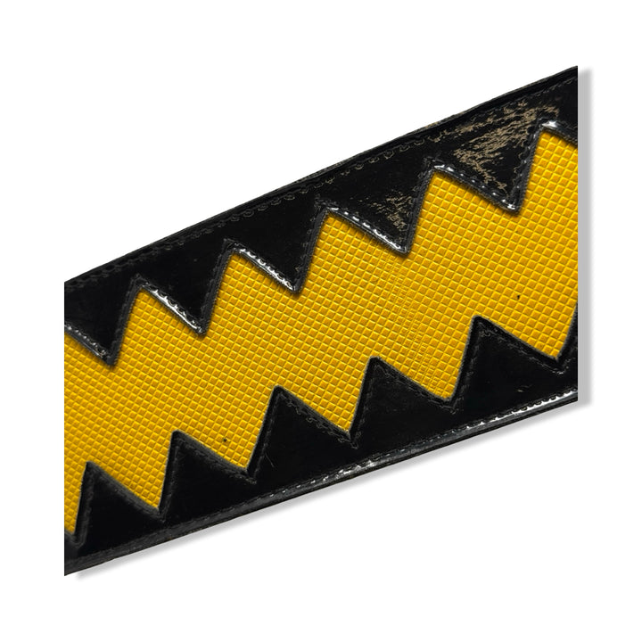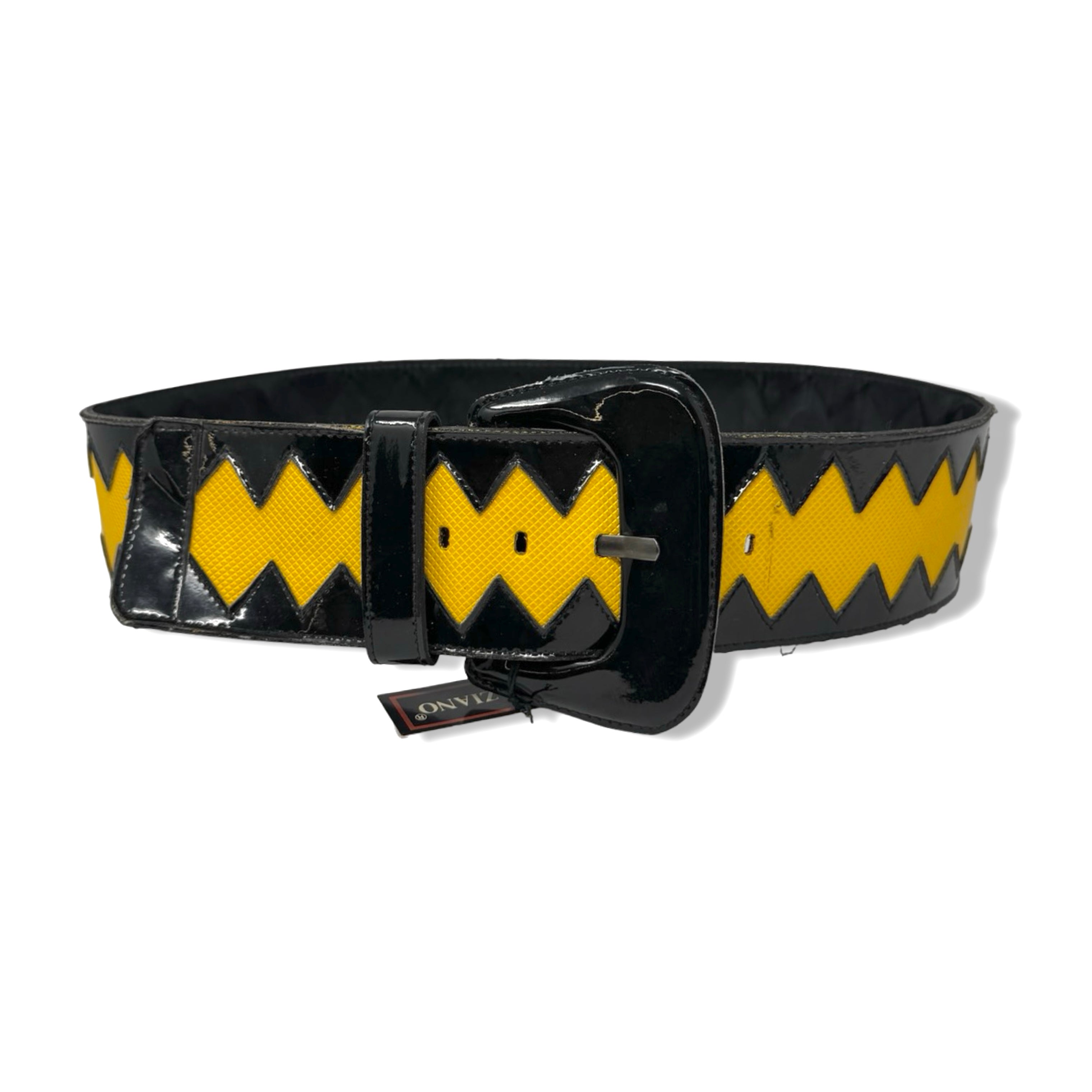 - Patent leather belt with zig zag designs and textured contrast panel. Original tags attached