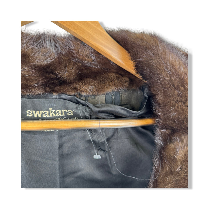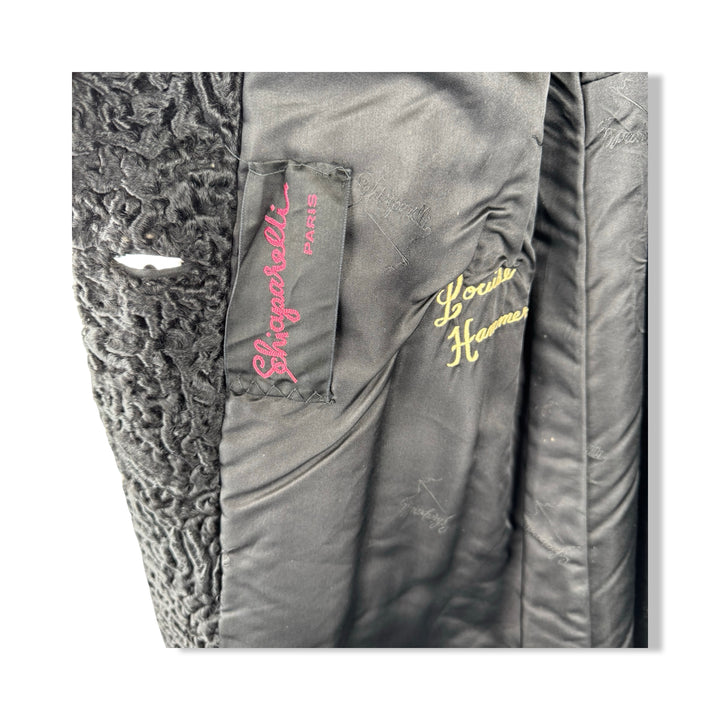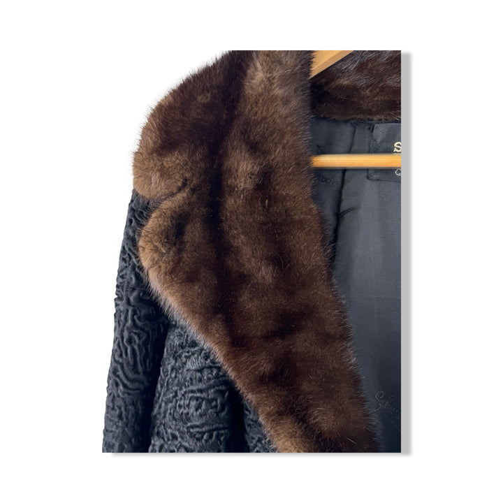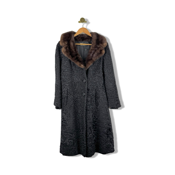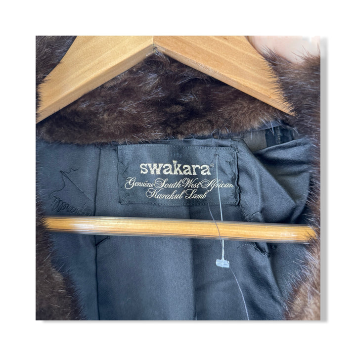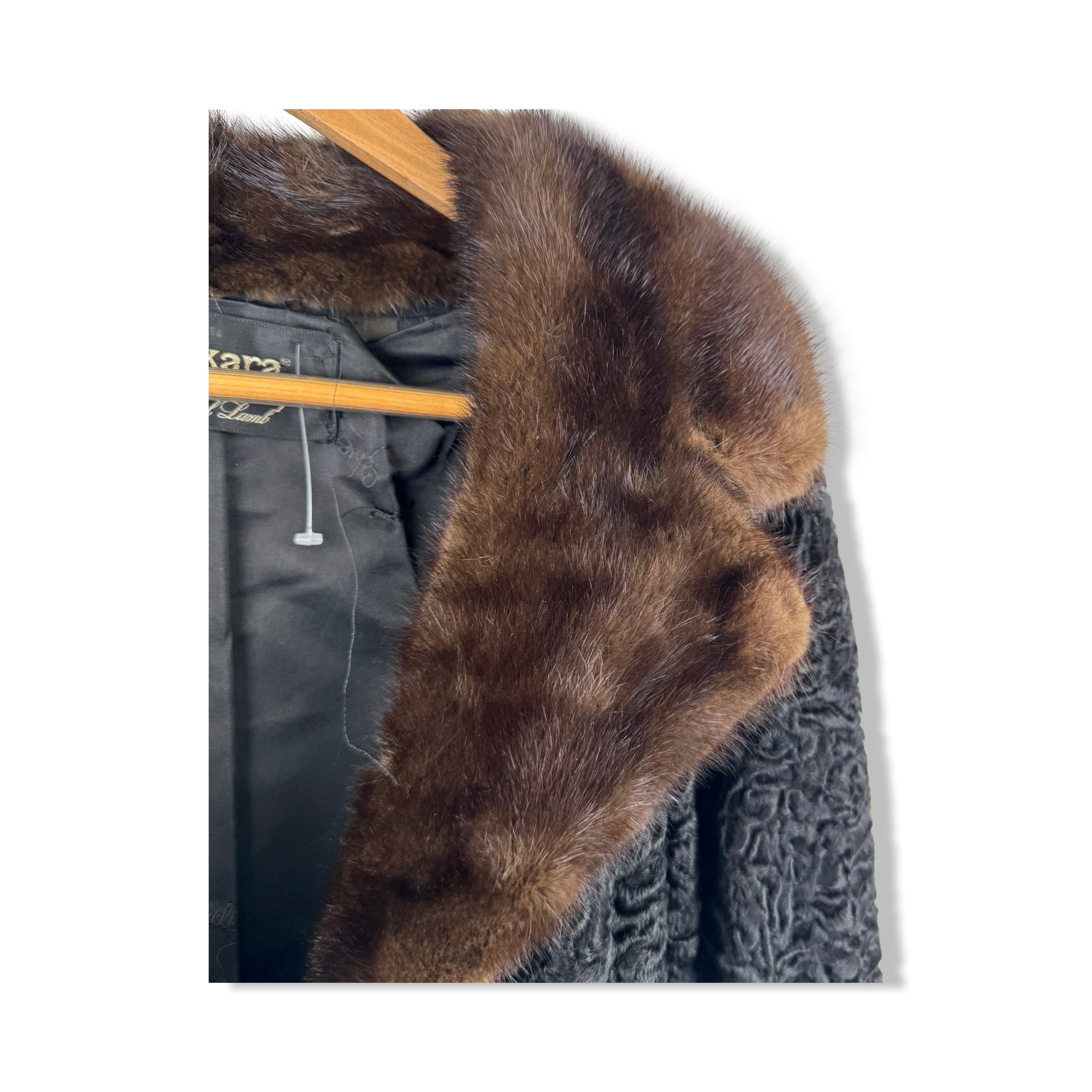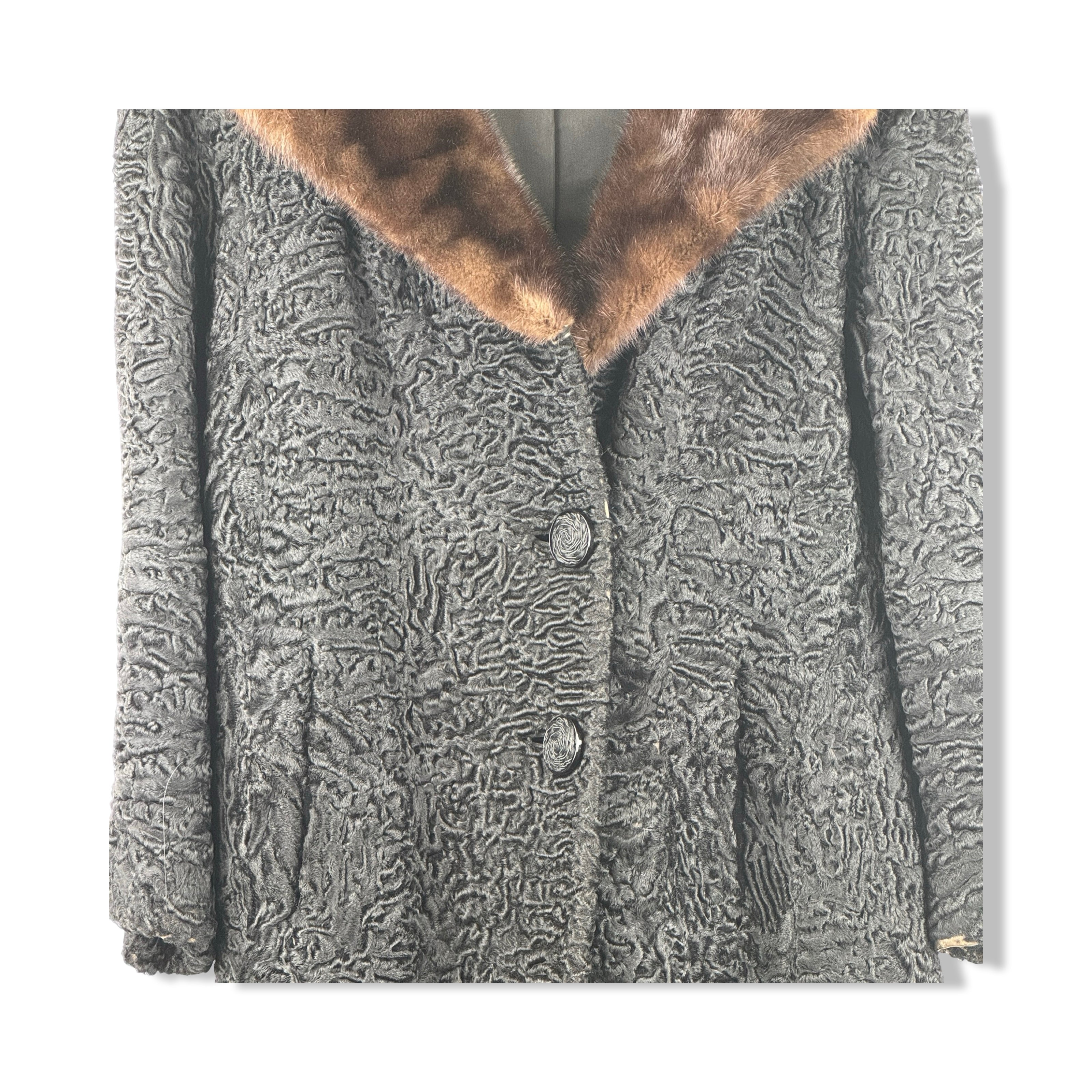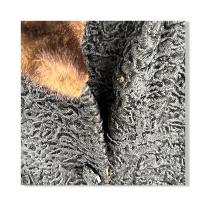 - African lamb coat with fur on collar and texturized material throughout. Button up closure. Detached button (pictured). Missing size label, looks like a size Small. Please check measurements for reference