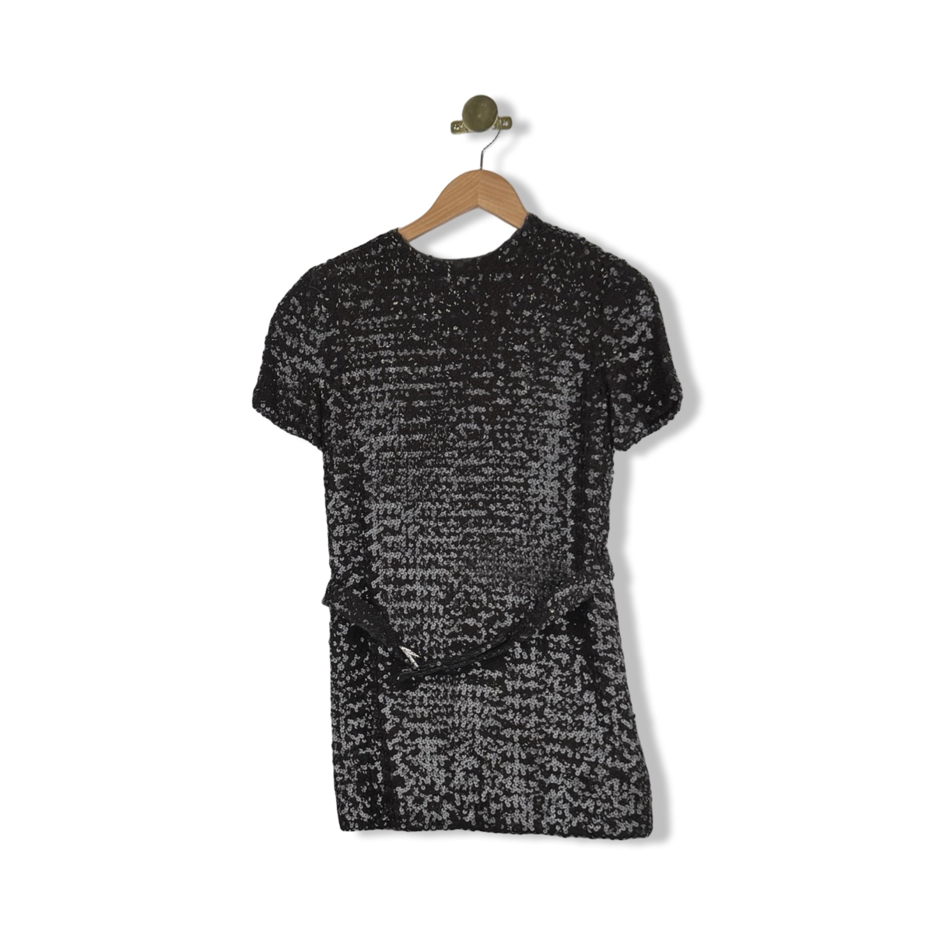 - Belted sequin mini dress. Repairable damage at back zip. (Pictured) Size not listed, Looks like a size Small. Please check measurements
