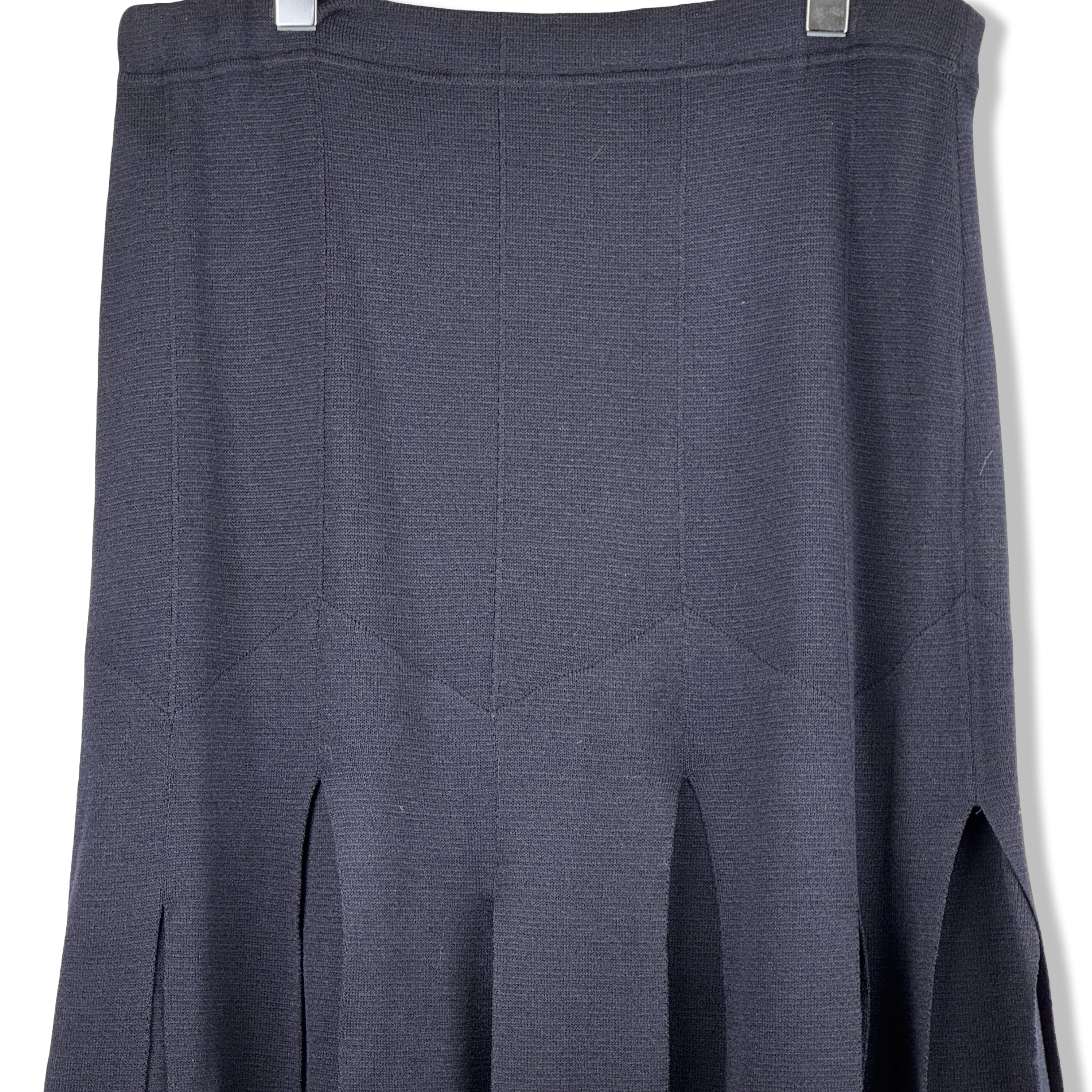- Knit skirt with elastic waistband, seam stitch detailing and cut-out hem.