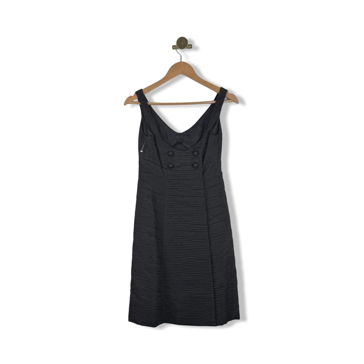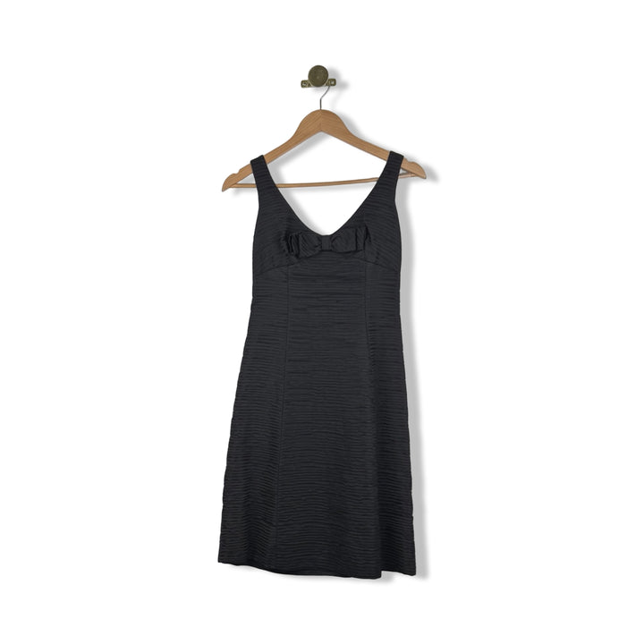 - Sleeveless mini dress with bow on front and snap/button closure on back. Signs of wear (pictured). Missing size label, looks like a size xx-small. Please check measurements for reference.