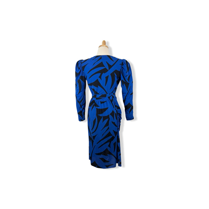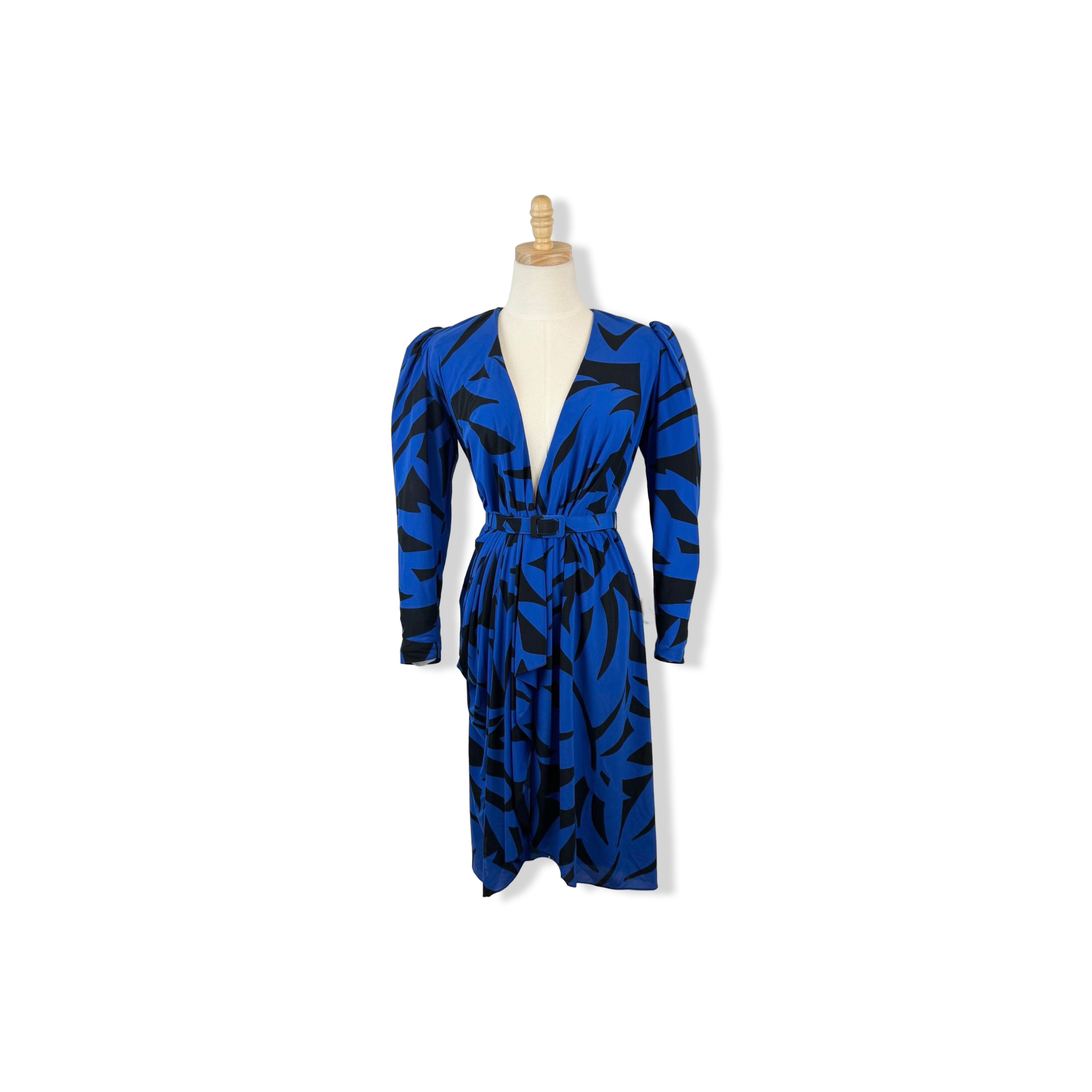 - Patterned dress with detachable belt, padded shoulders, and front hook closure.