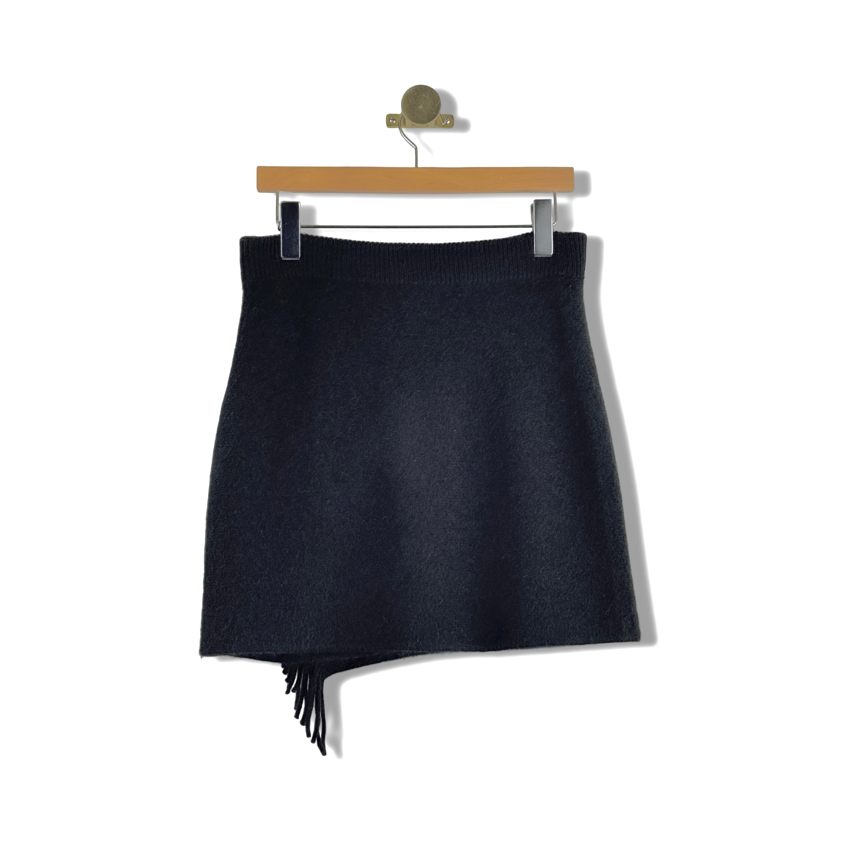 - Knit pull on mini skirt with fringe overlay detail on front. Elastic waistband