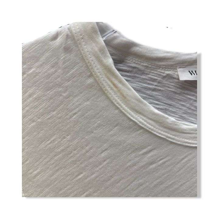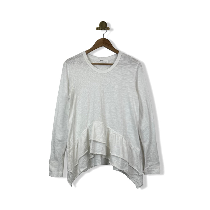 - This long sleeve t-shirt features a stylish ruffle hem. Signs of wear on collar