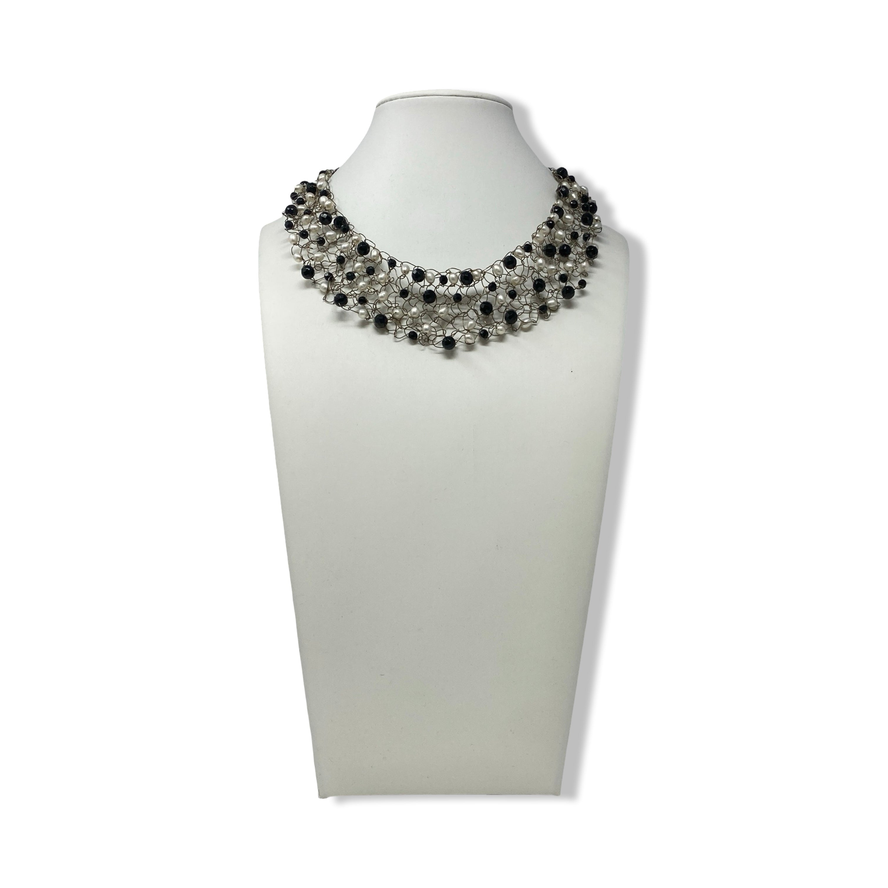 - Wired necklace with bead and pearl pendants throughout. Lobster claw clasp. Marked "925"