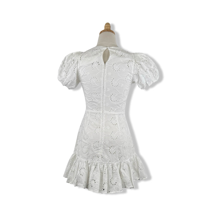 - Puff sleeve mini dress with eyelet pattern and back zip closure