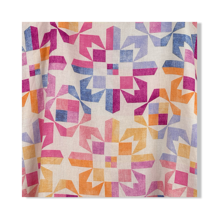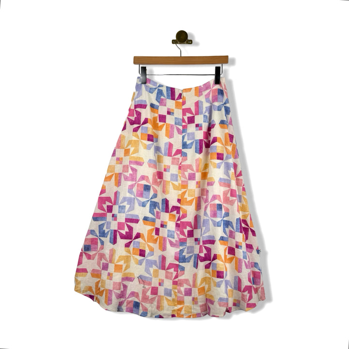 - A-line midi skirt with zip closure on back and geometric print throughout.