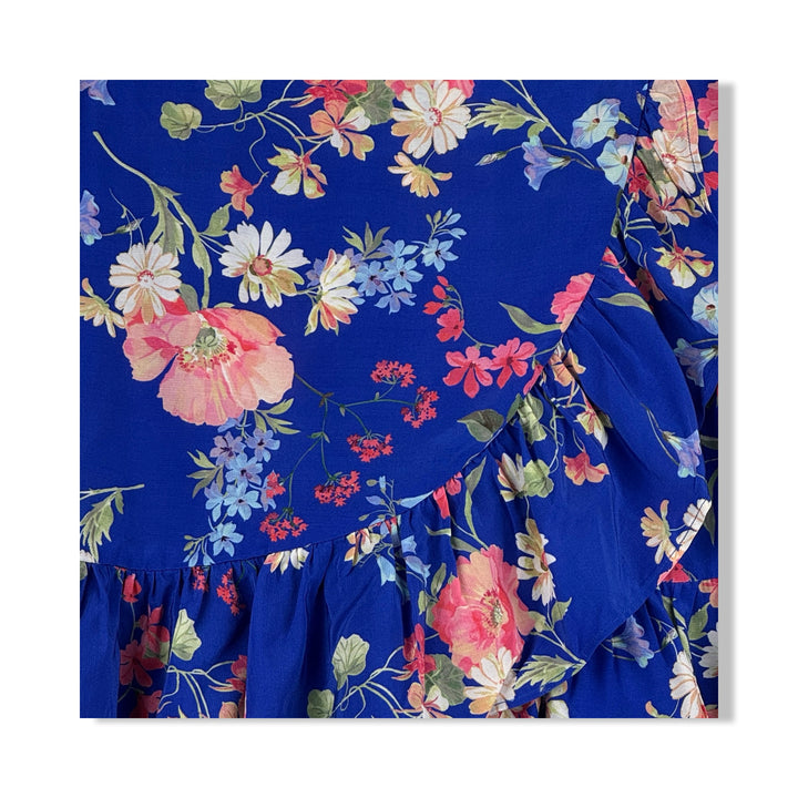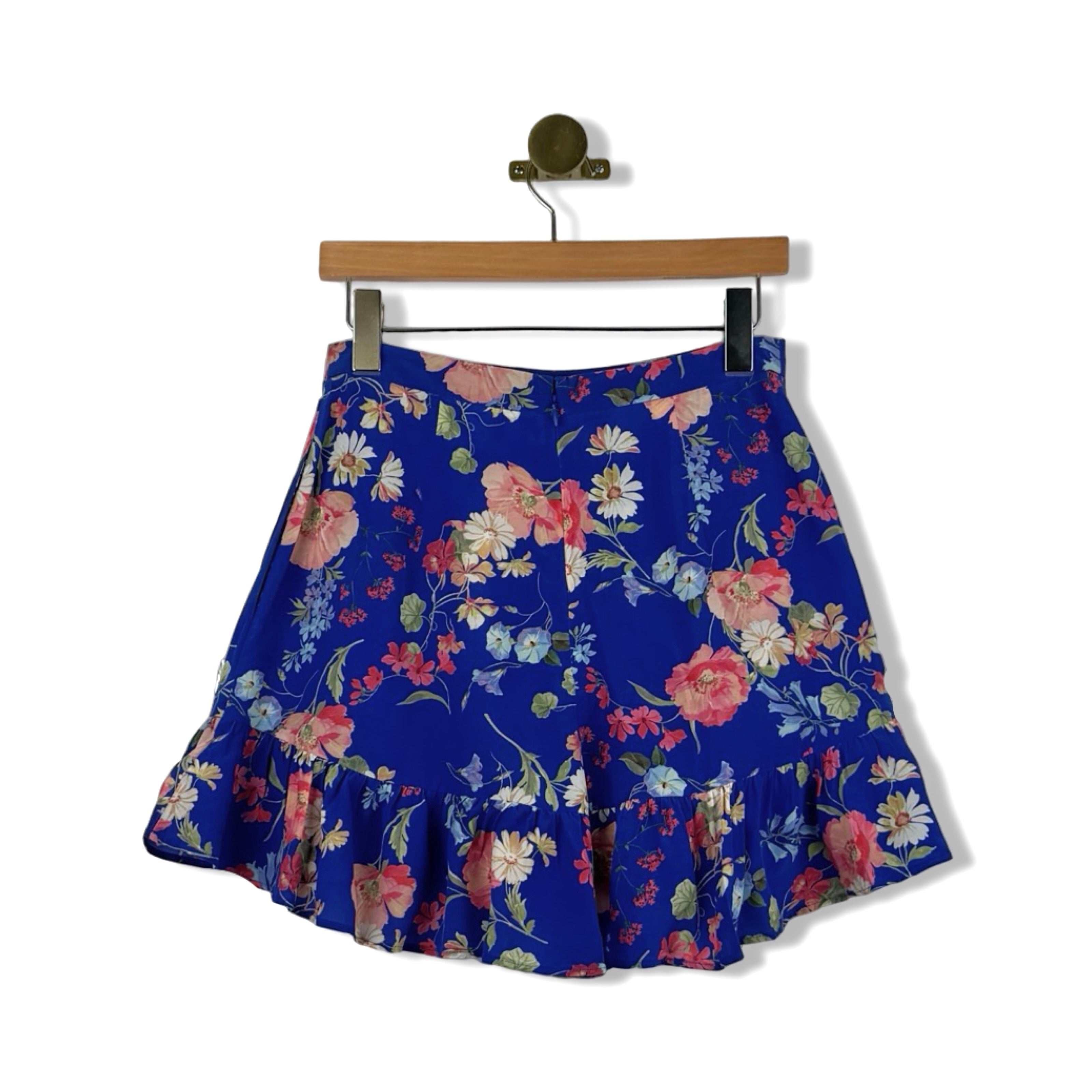 - Crossover mini skort with ruffle trim detail and zip closure on back. short detail on interior.