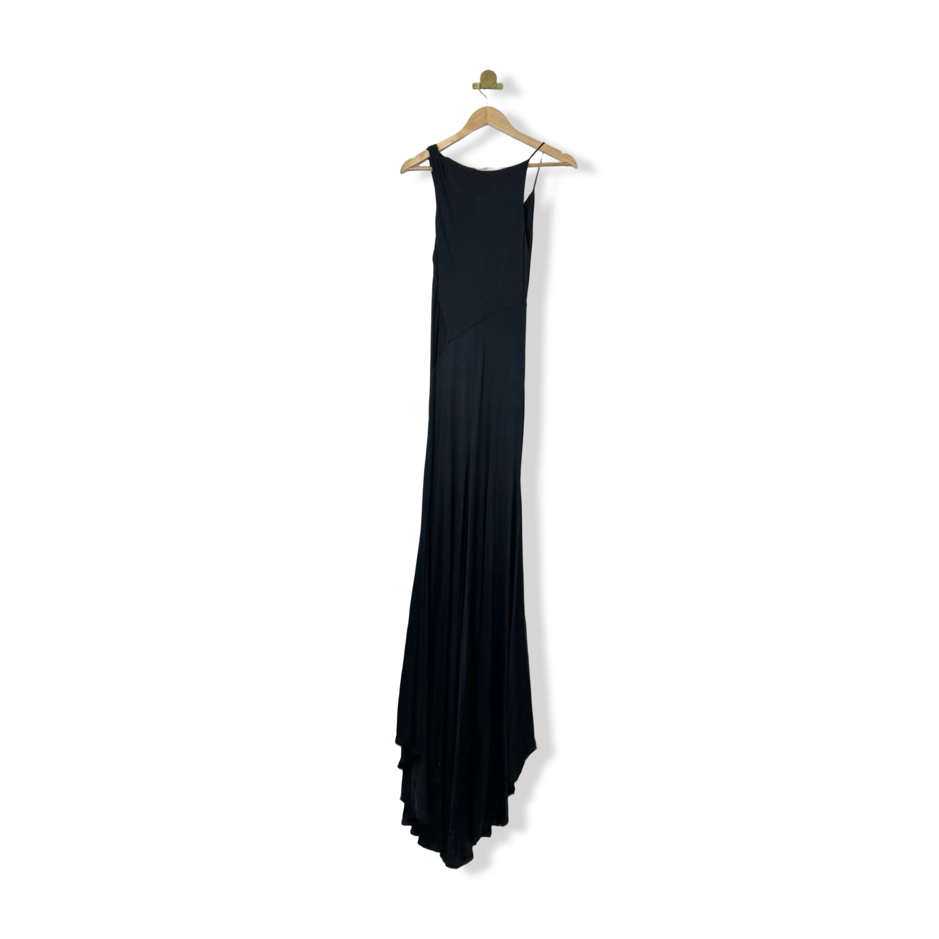 - Plunge neck maxi dress with asymmetrical straps and side zip closure. Size label missing, feels like an X-Small. Please check measurements for accurate sizing