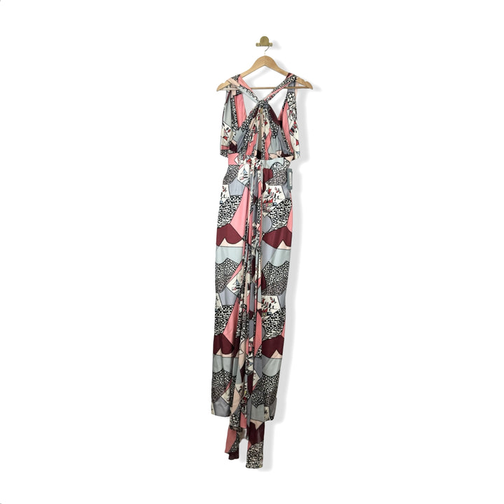 - Ready to Wear 2006 collection. Abstract print maxi dress with open keyhole detail on front, v-neck back and gathered detail on front. Back zip closure. Signs of loose thread on front (pictured). Missing designer and size label, looks like a size X-Small. Please check measurements for accurate sizing.