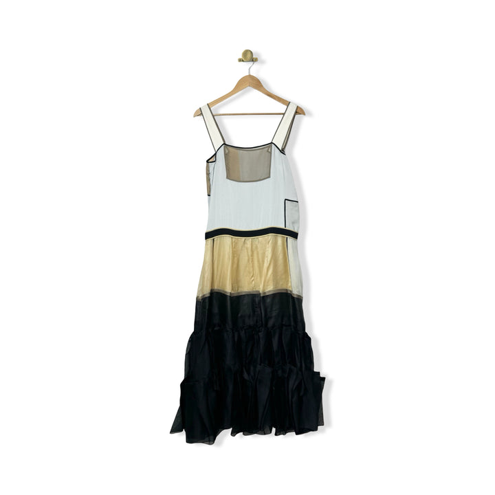 - Color block dress with ruffle skirt and side zip closure. Missing designer and size label, looks like a size X-Small. Please check measurements for reference.