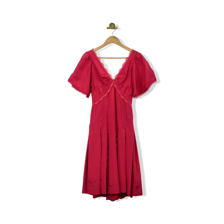 - A dress that's the perfect mix of playful and chic. Featuring a V-neck with puffed sleeves, delicate lace trim, and a twirly pleated skirt. Don't miss the fun seam stitching on the front and back, plus a back zipper for easy entry (and epic dance floor exits)! Missing size label, looks like a size x-small. Please check measurements for reference.