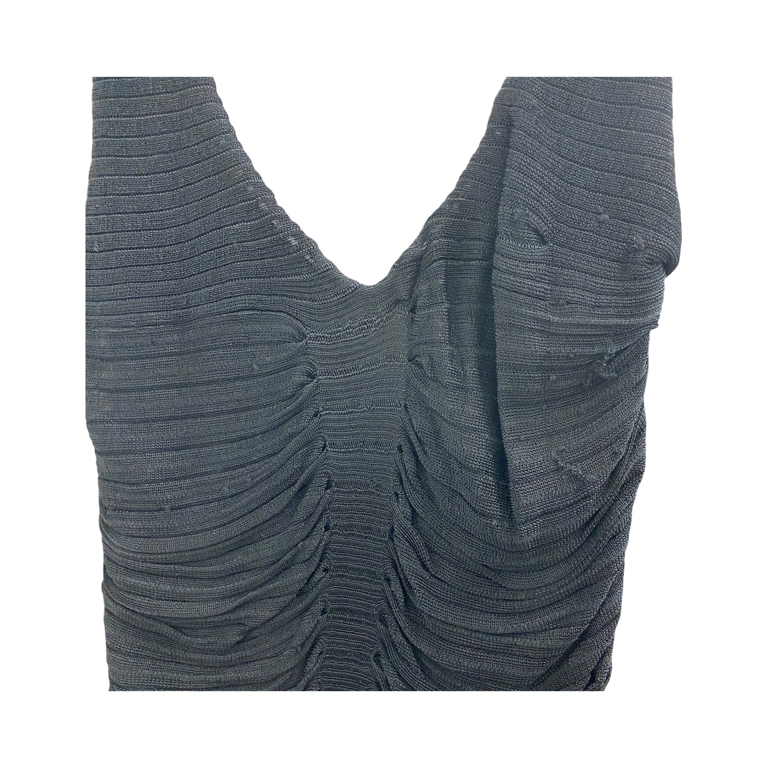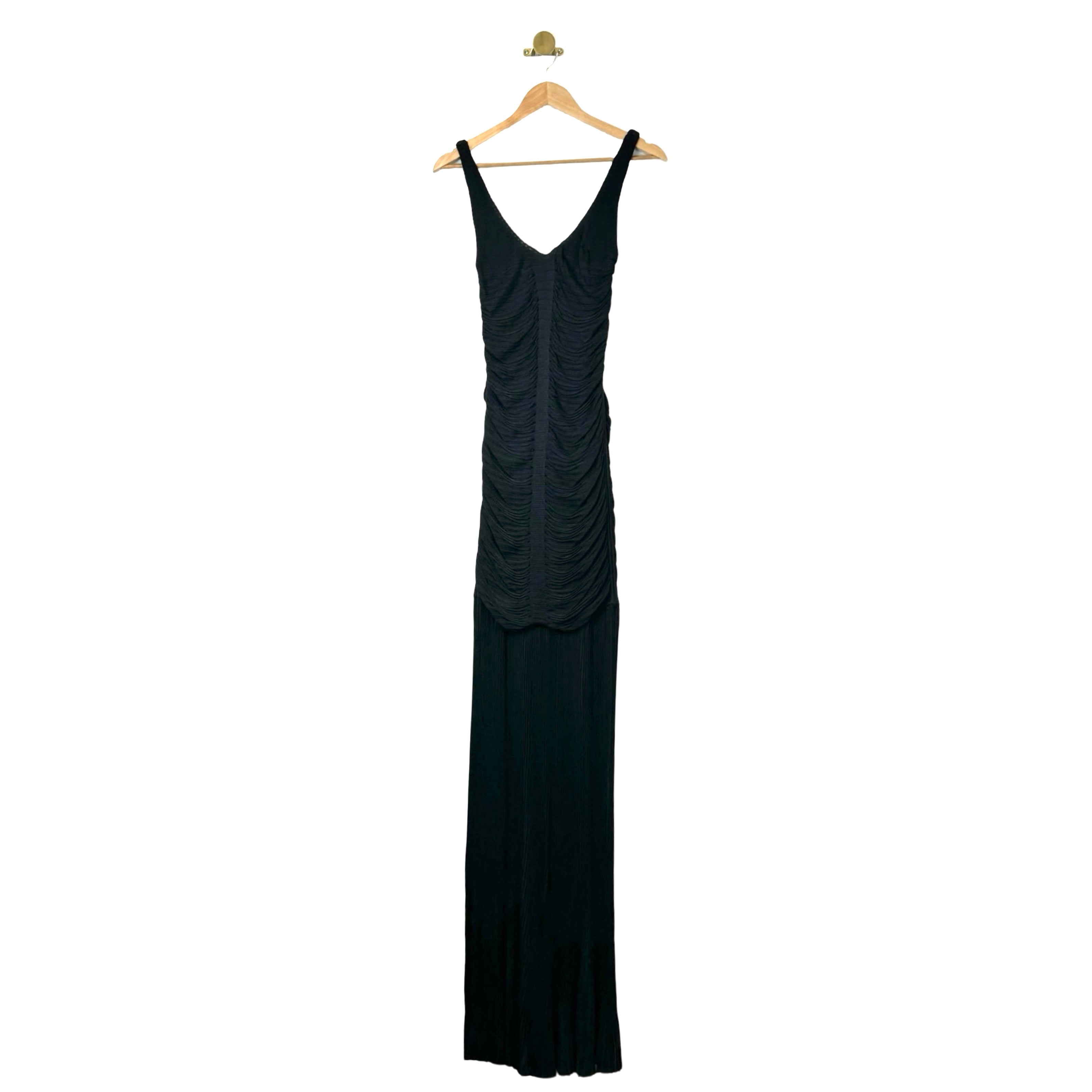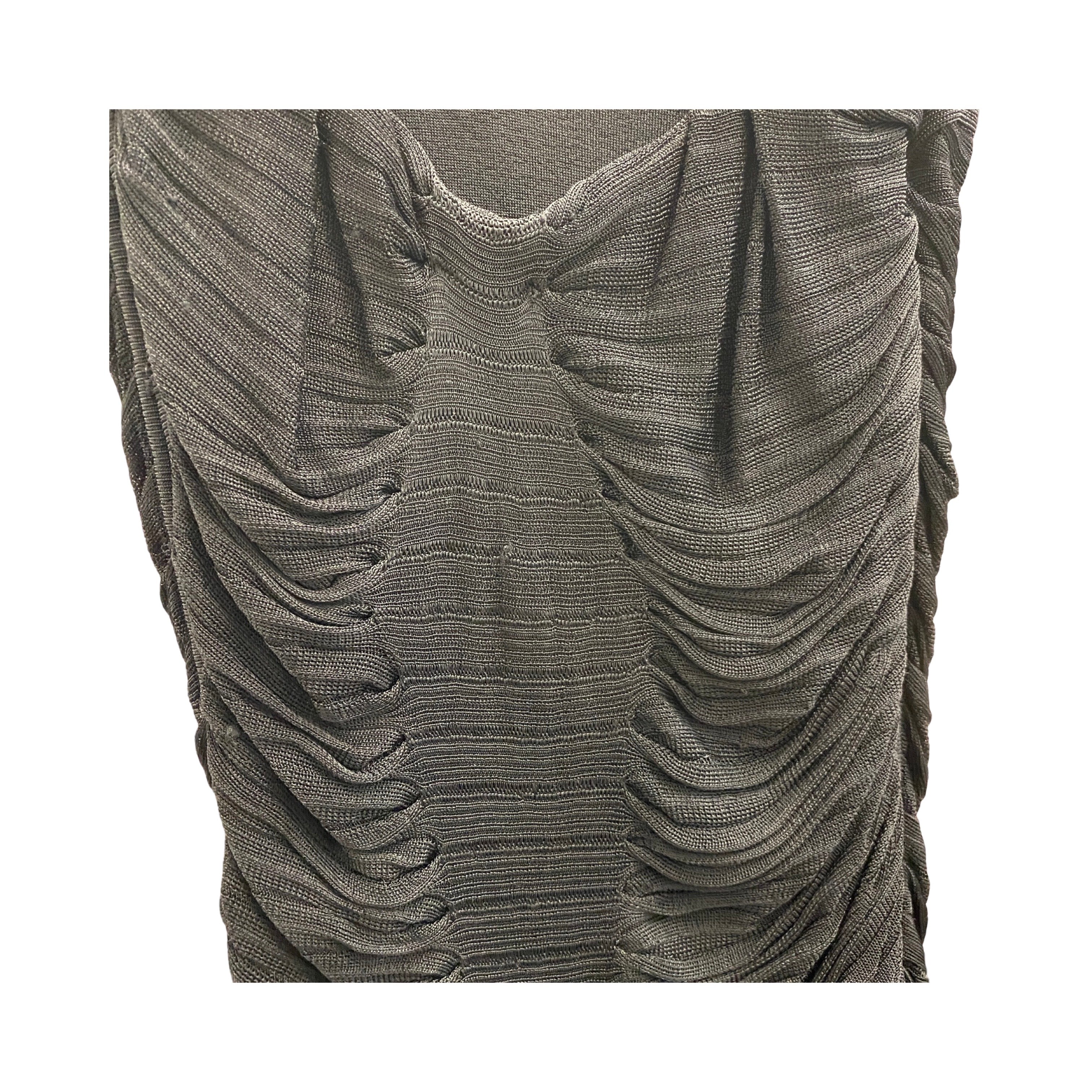 - Draped knit maxi dress with pleat and ruched detail throughout and a side zip closure. Missing designer and size label, looks like an X-Small. Please check measurements for reference. Signs of wear throughout (pictured).