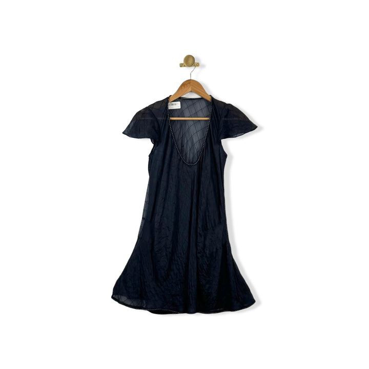 - Unleash your inner glamour with the Zac Posen Sheer Scoop Neck Dress. This stunning dress features a sheer scoop neck adorned with delicate beaded detailing, adding a touch of elegance to your look. Perfect for any special occasion, this dress will make you feel like a true fashion icon. Size label missing, looks like size X-Small