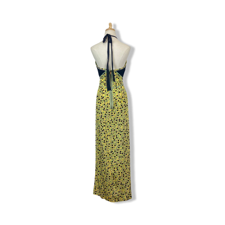 - Ready to Wear 2011 Collection. Halter dress with contrast panels on center, front wrap slit detail, zip closure and self tie on back. Missing size label, looks like a size x-small. Please check measurements for reference. Signs of wear (pictured)