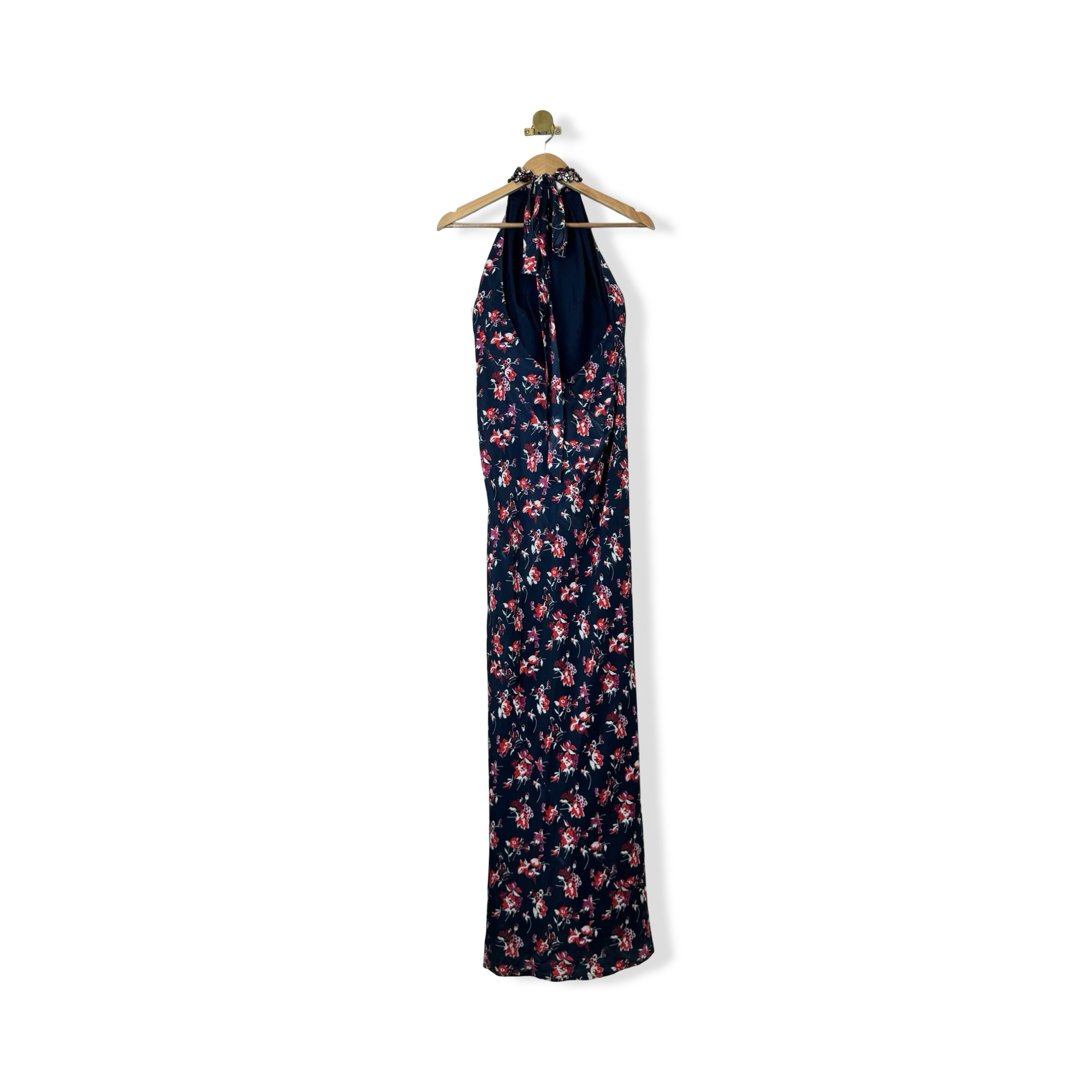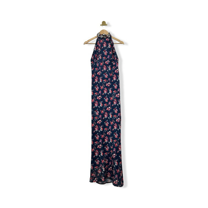 - Embellished floral halter maxi dress with back zip closure. Missing size label, looks like an X-Small. Please check measurements for accurate sizing