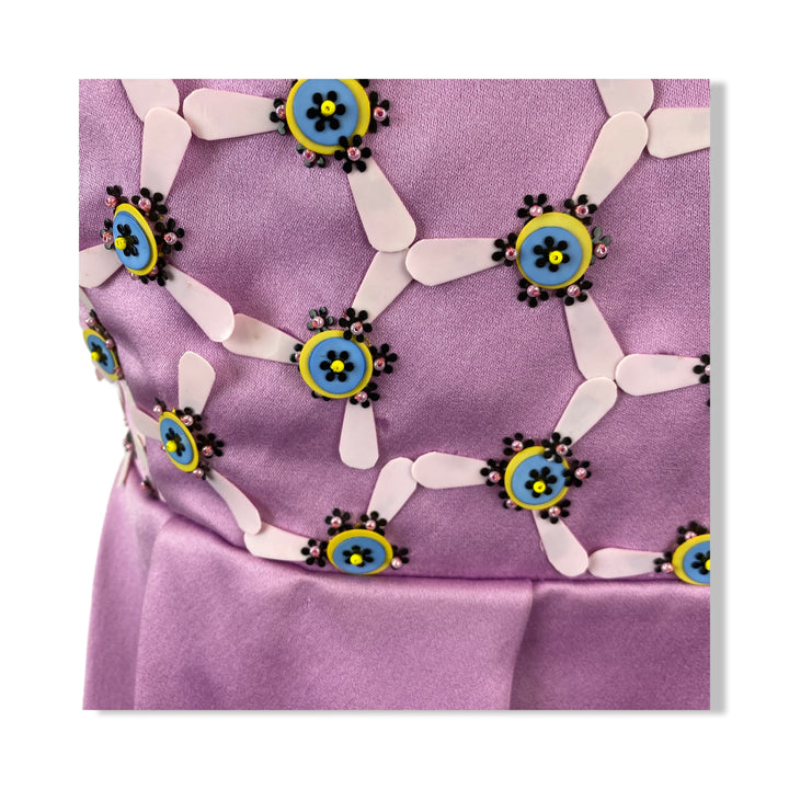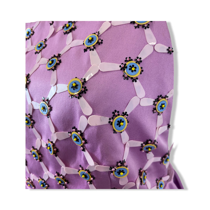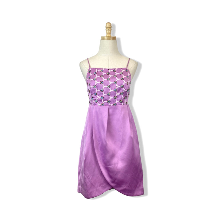 - Expertly crafted from luxurious silk, this dress is a stunning addition to any wardrobe. With intricate bead detailing on the chest and an overlay skirt, this mini dress exudes elegance and sophistication. The cross back strap and convenient zip closure make for easy wear. Missing size label, looks like a size X-Small. Please check measurements for reference.
