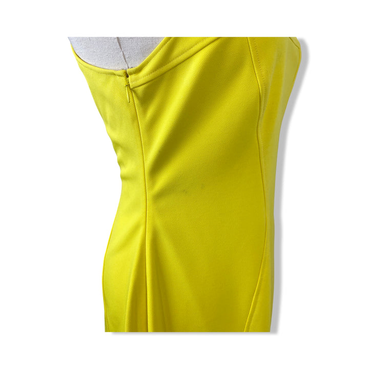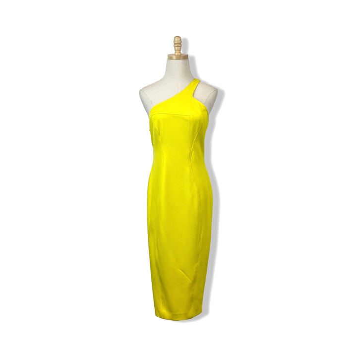 - This one shoulder dress features seam stitch detailing throughout and a side zip closure, with an added zip closure slit on the hem. Signs of wear (pictured)