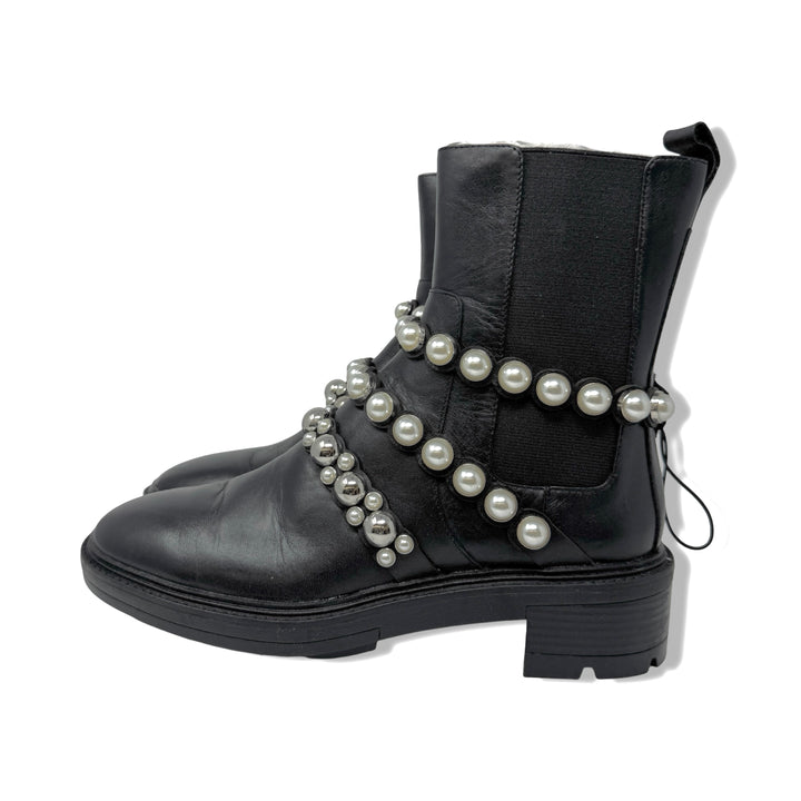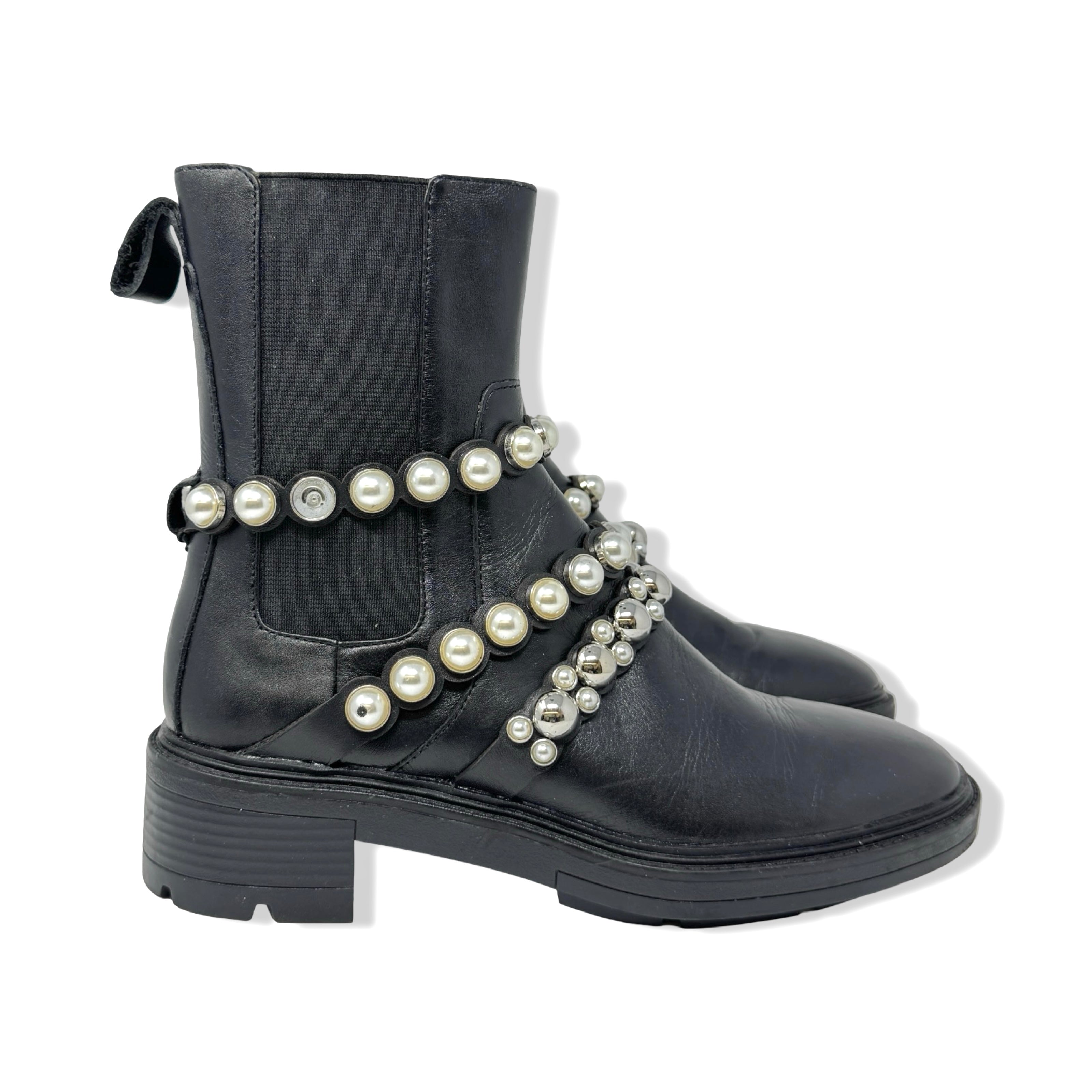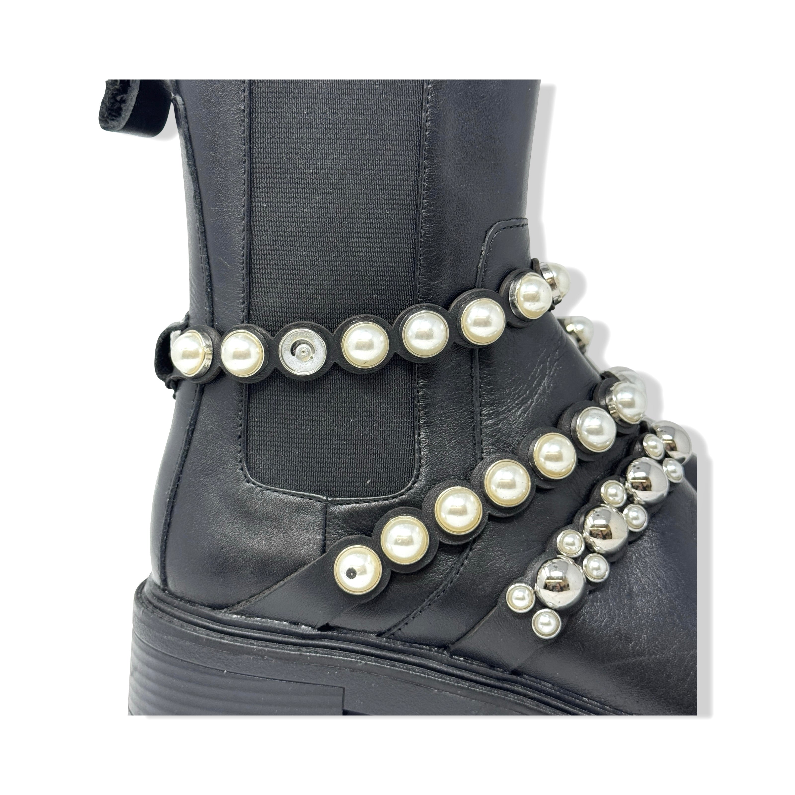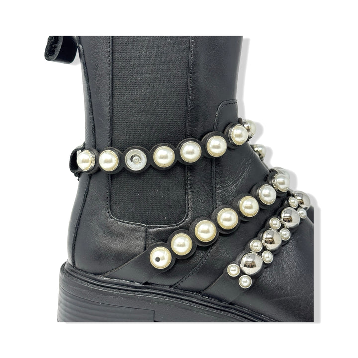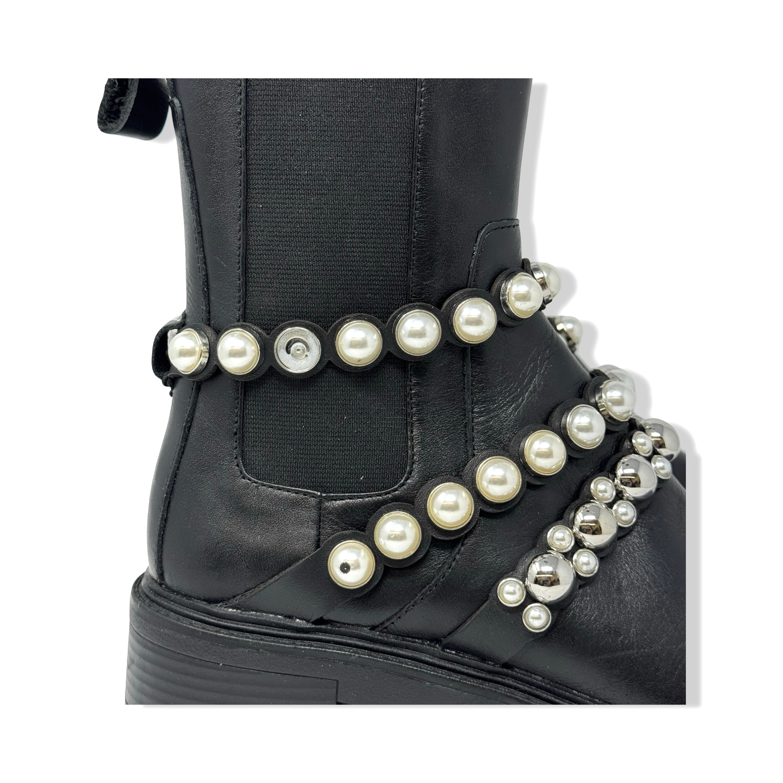 - Slip on chelsea boot with embellished pearl straps, elastic panels, and pull tab. Missing faux pearl detail (pictured)