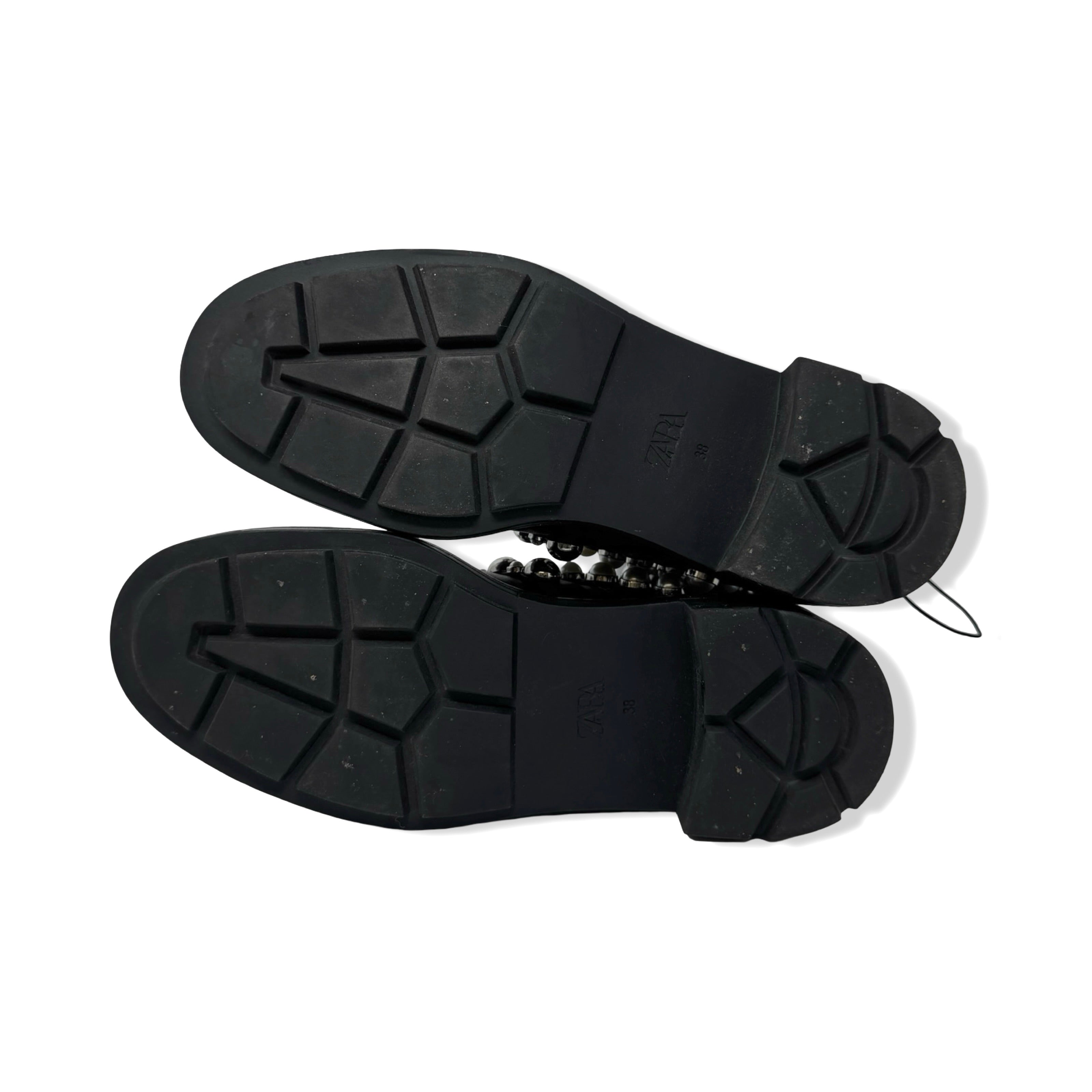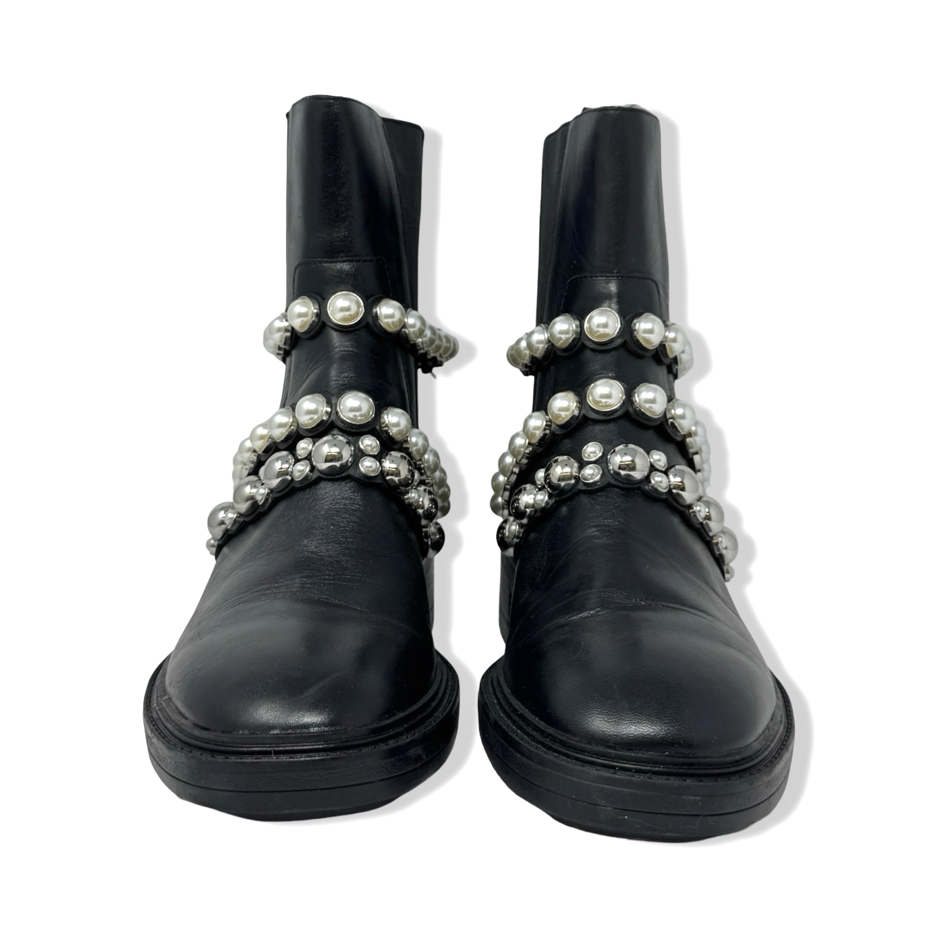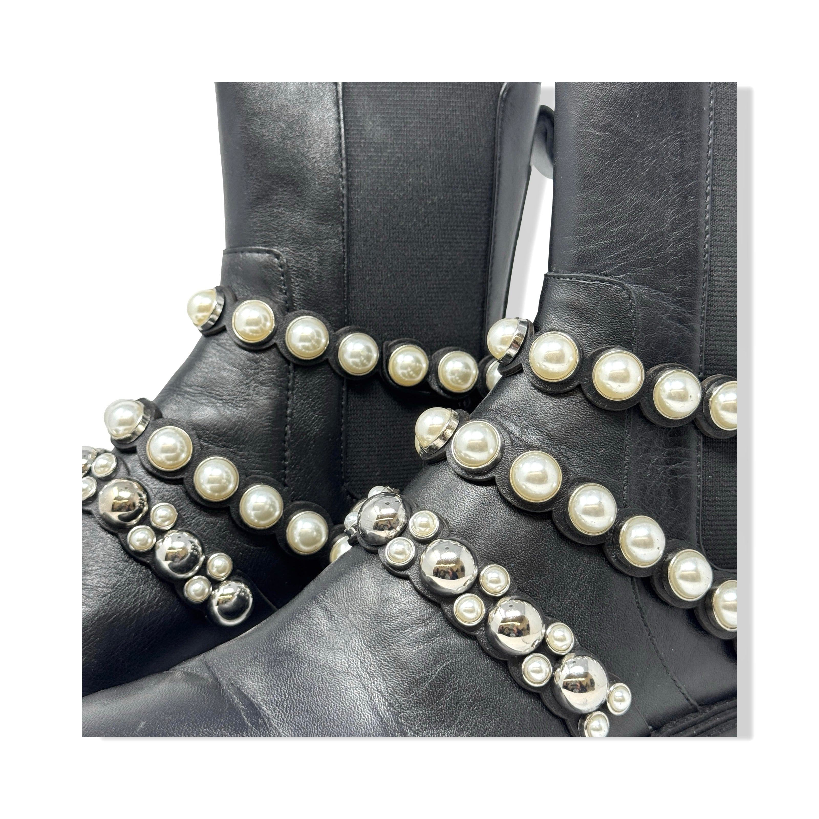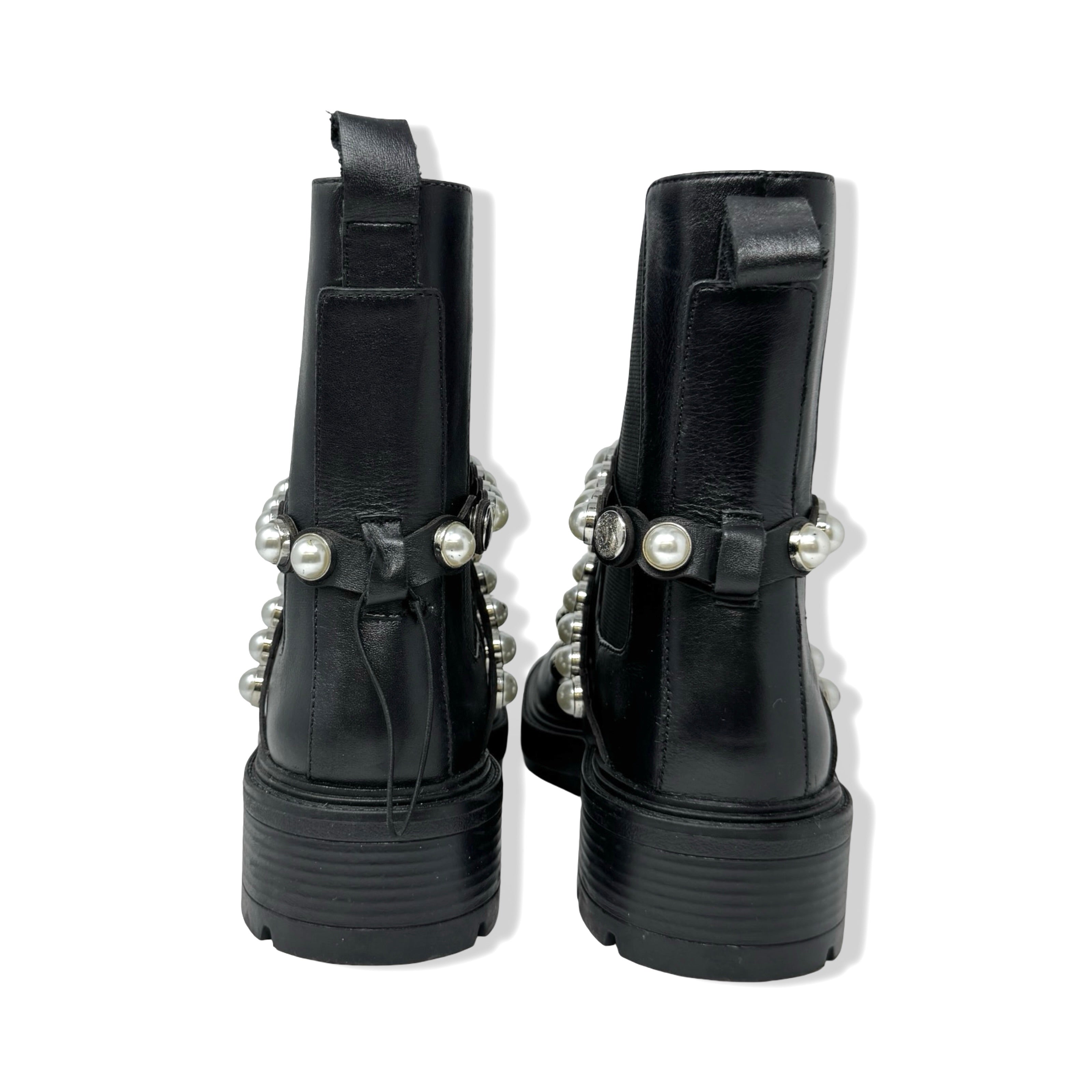 - Slip on chelsea boot with embellished pearl straps, elastic panels, and pull tab. Missing faux pearl detail (pictured)